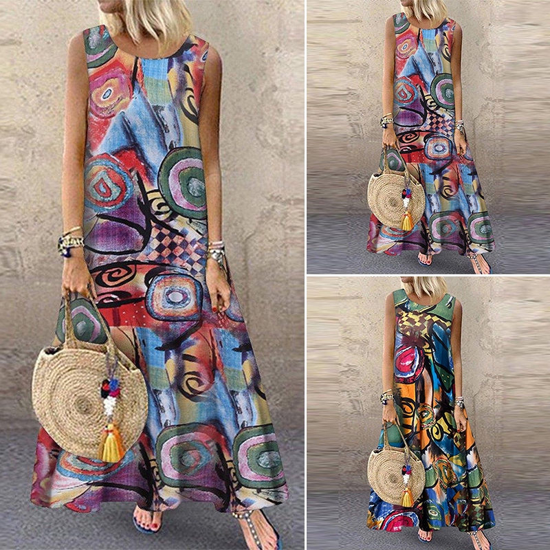ZANZEA Women Sleeveless Printed Loose Plus Size Maxi Dress