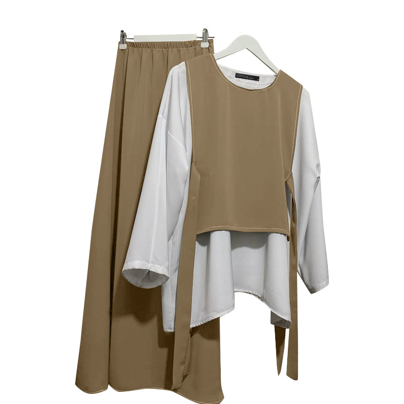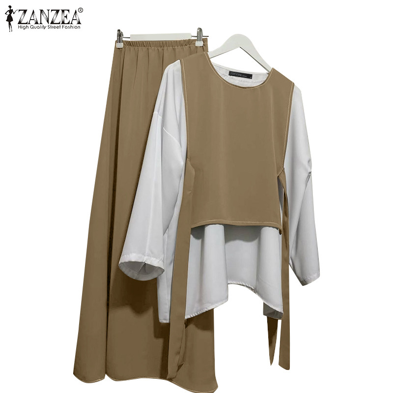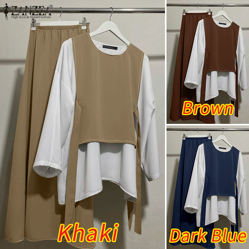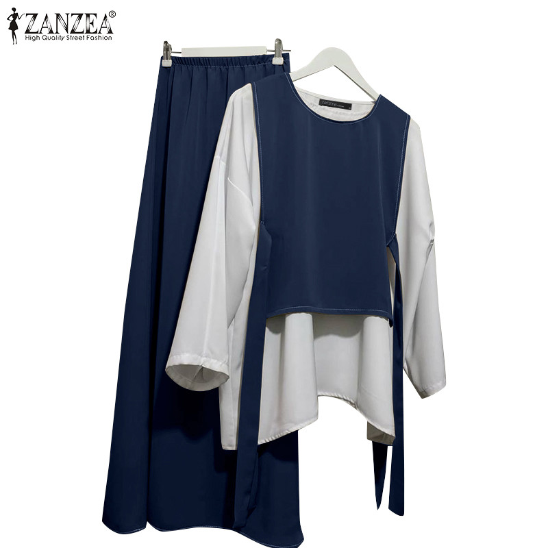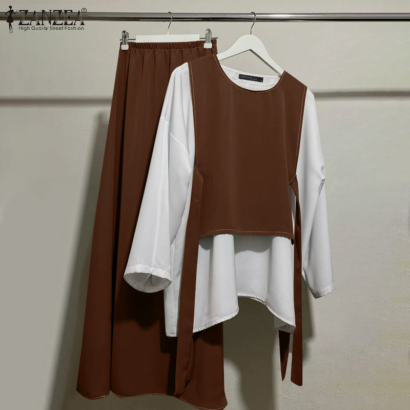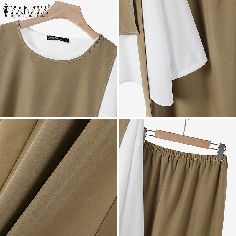 ZANZEA Women Vintage Fake Two Pieces Splicing Color Blocking Loose Long Sleeve Tops&Trousers