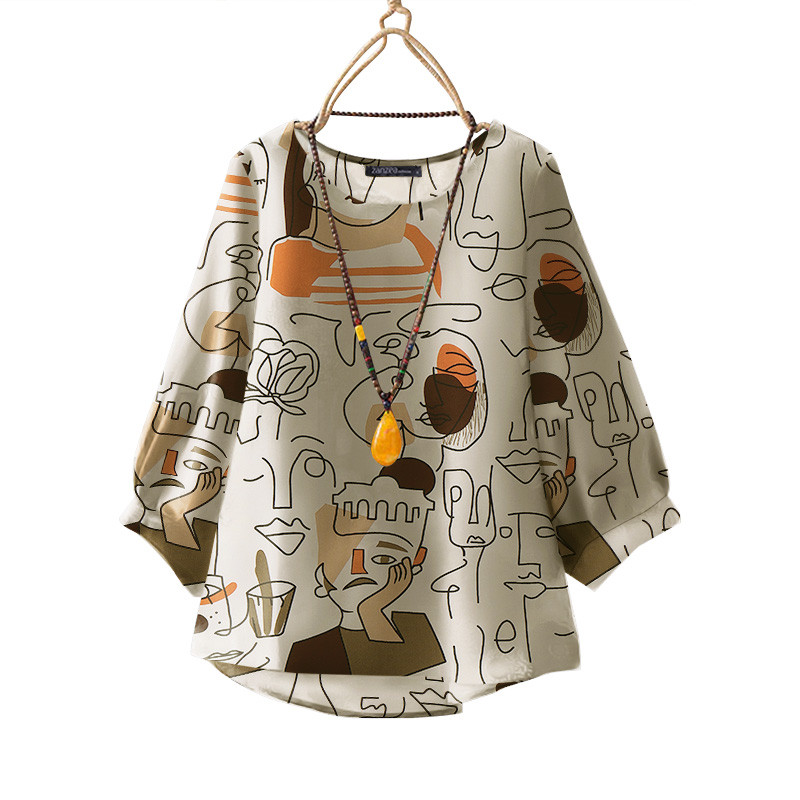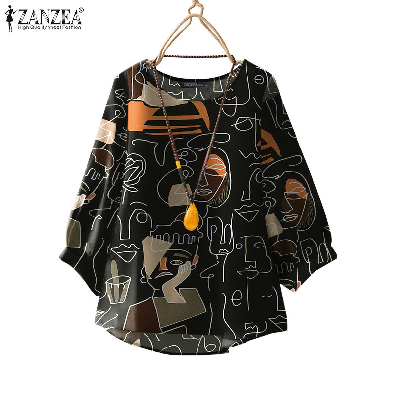 ZANZEA Women's Vintage Casual Round Neck Split Sleeve Loose Abstract Print Blouse