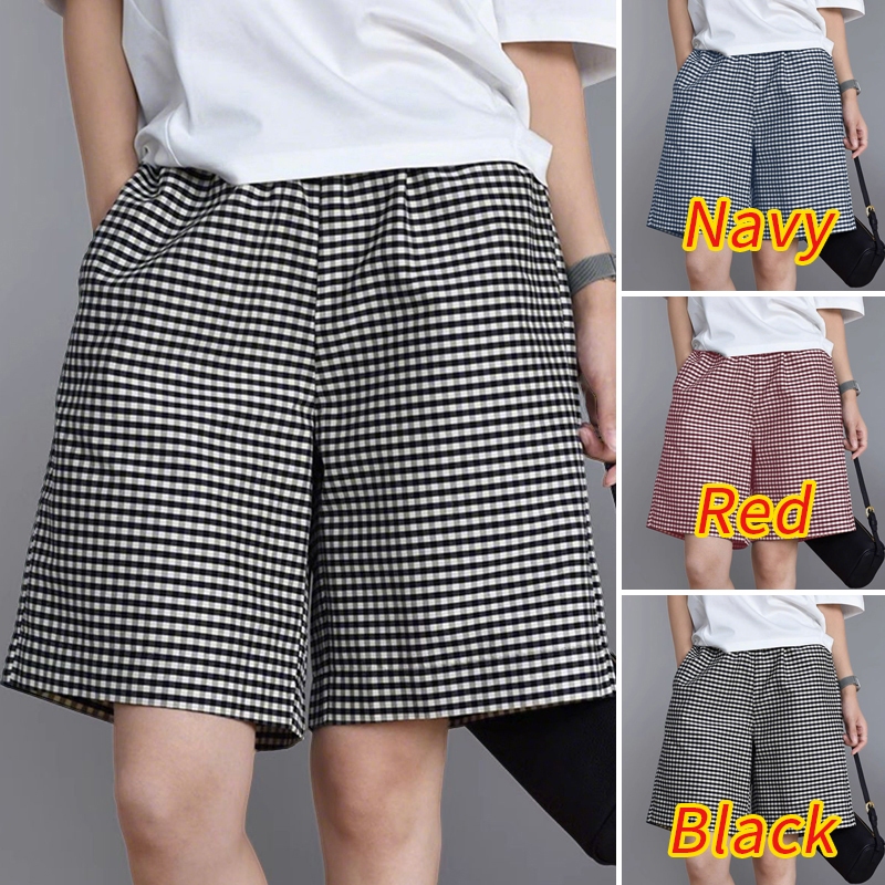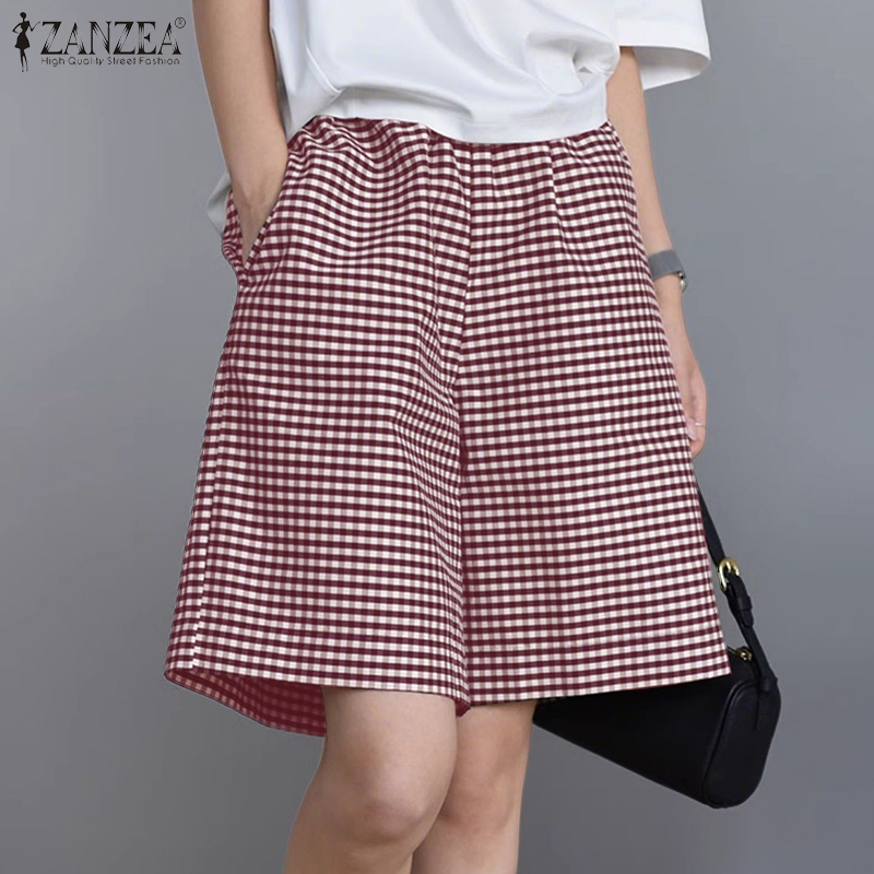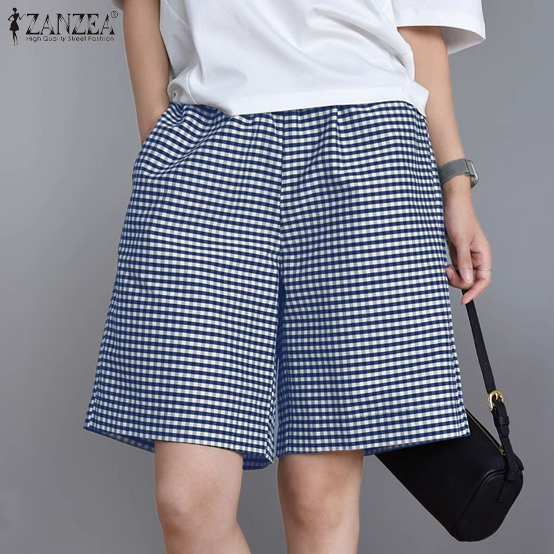 Zanzea Women Korean Casual Plaid Pocket High Waist Elastic Shorts