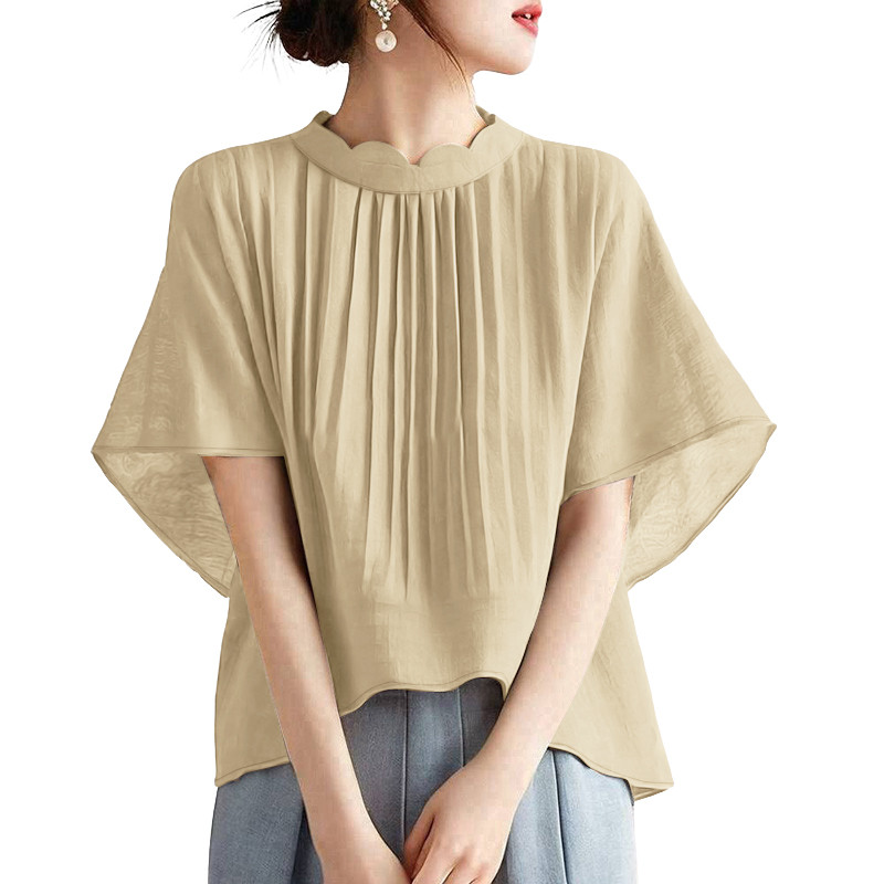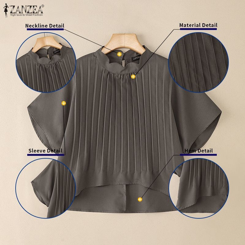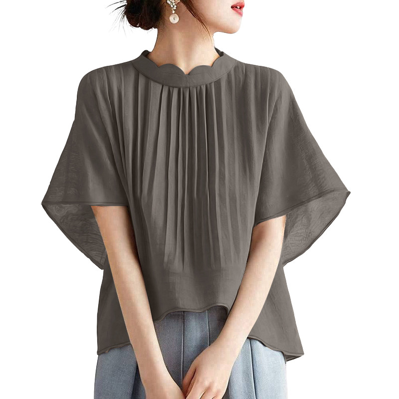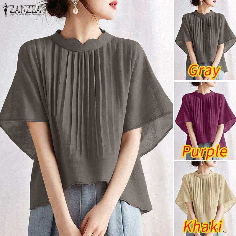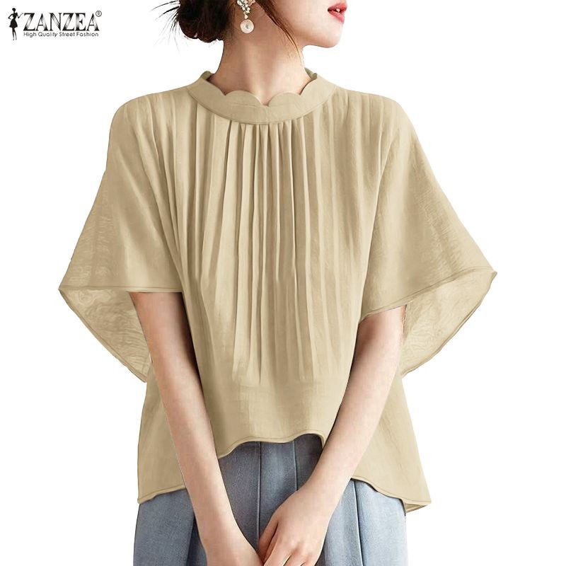 ZANZEA Women's Korean Fashion Elegant Short Sleeve Solid Color Blouse with Standing Collar