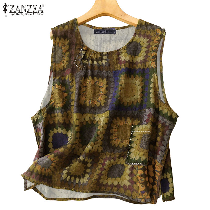 ZANZEA Women Korean Casual Round Neck Sleeveless Loose Printed Tank Tops