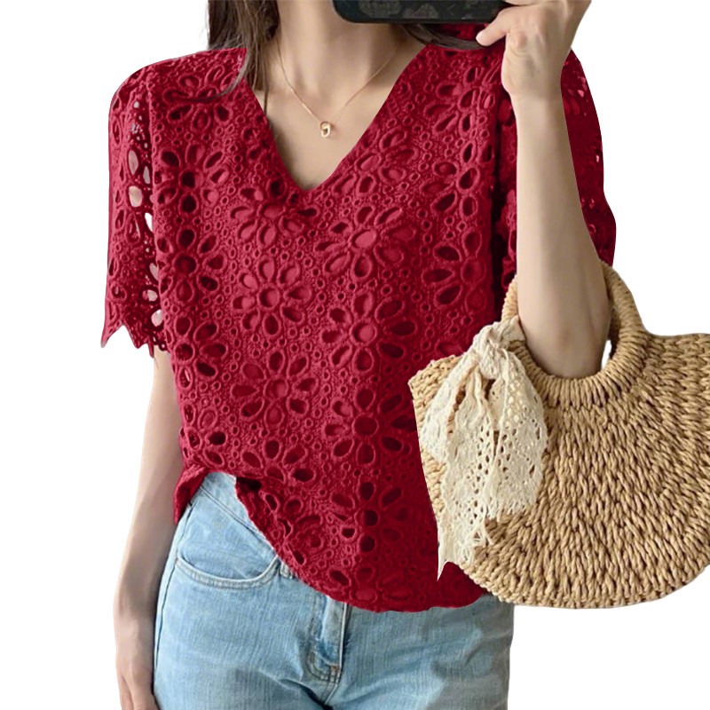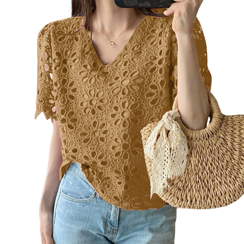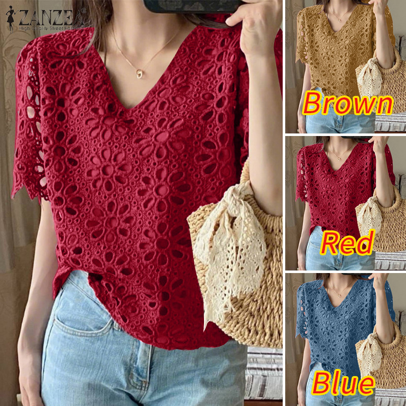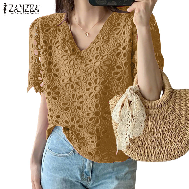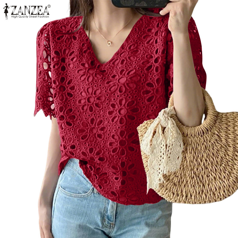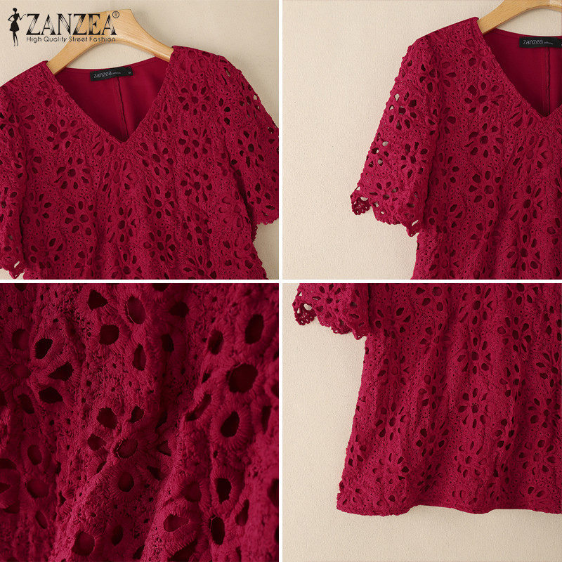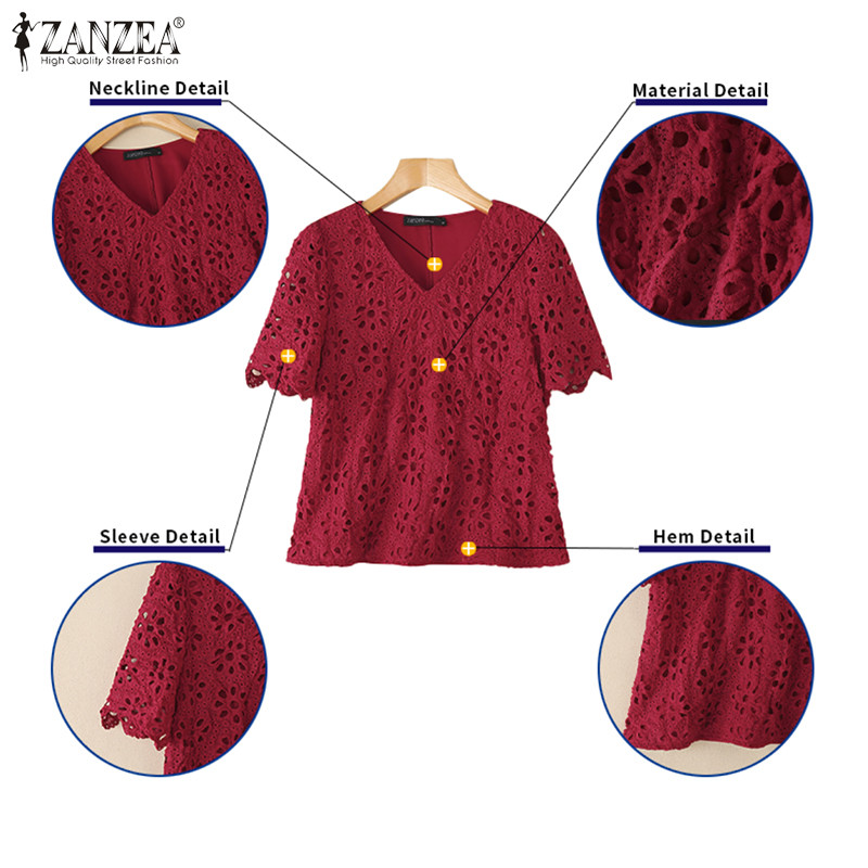 ZANZEA Women Korean Vacation Style V Neck Delicate Hollow Out Crochet Short Sleeve Blouses