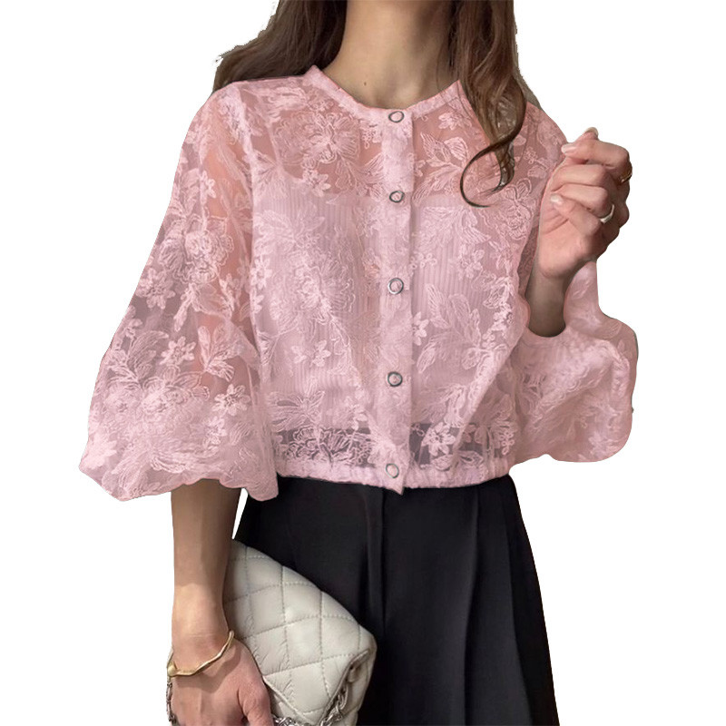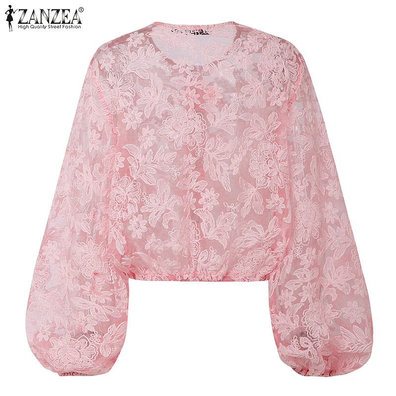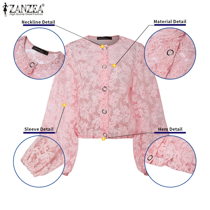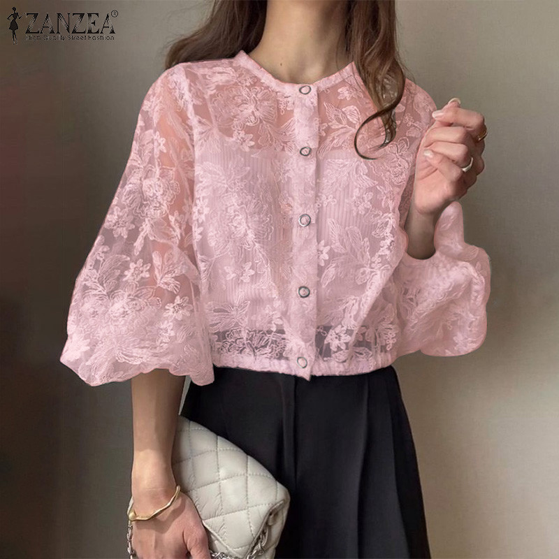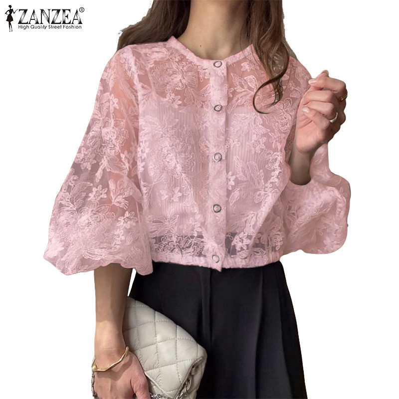 ZANZEA Women Korean Casual Round Neck 3/4 Lantern Sleeve Buttons Front Lace Patchwork Shirts