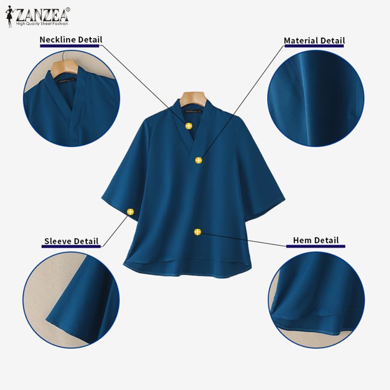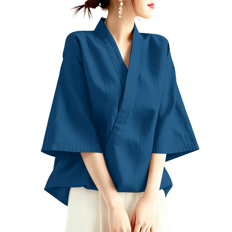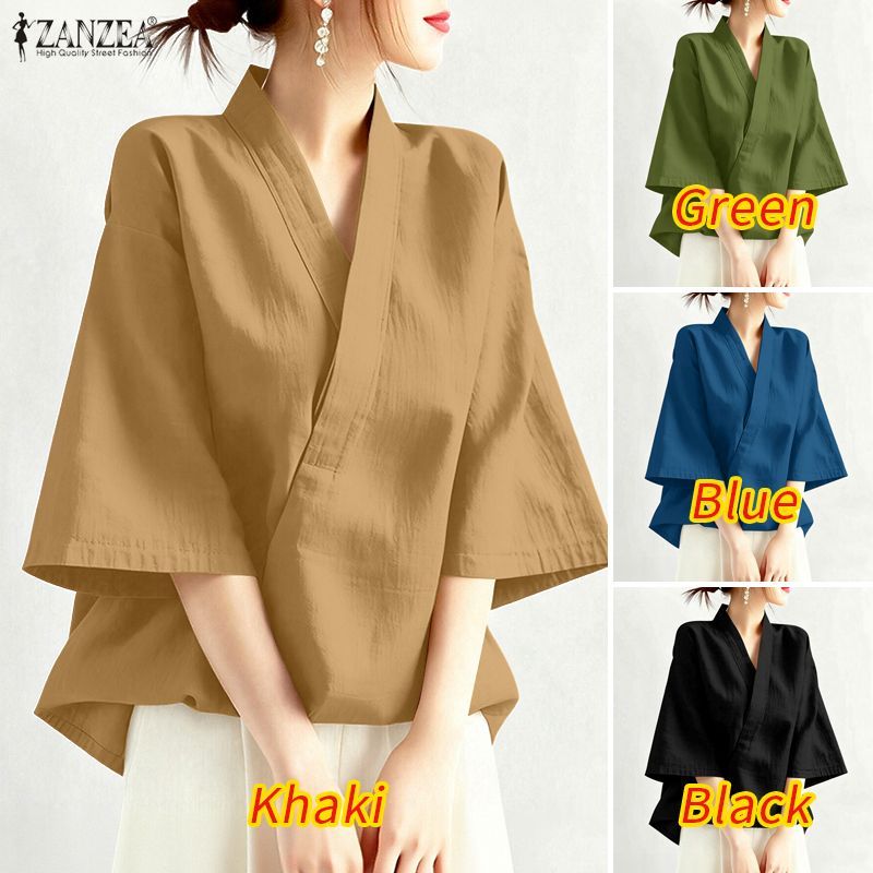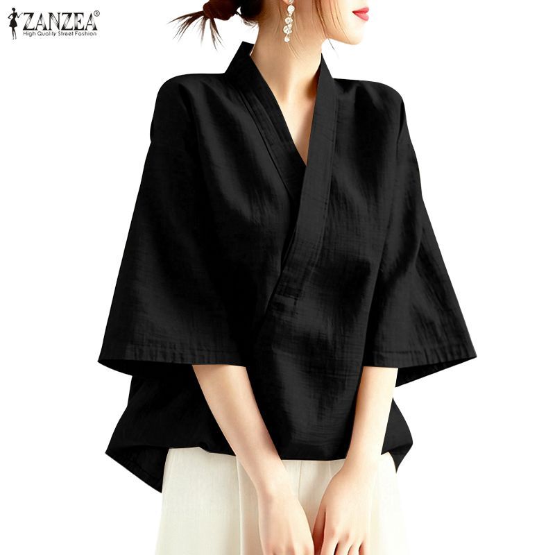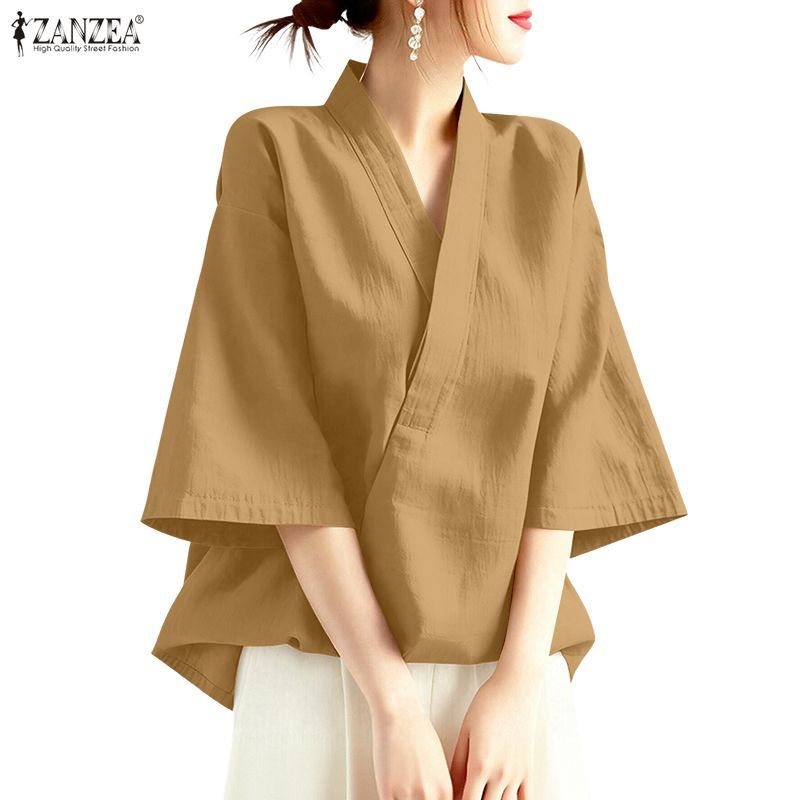ZANZEA Women's Korean Fashion Crossover V-Neck Three-Quarter Sleeve Modern Chinese Kimono Blouses