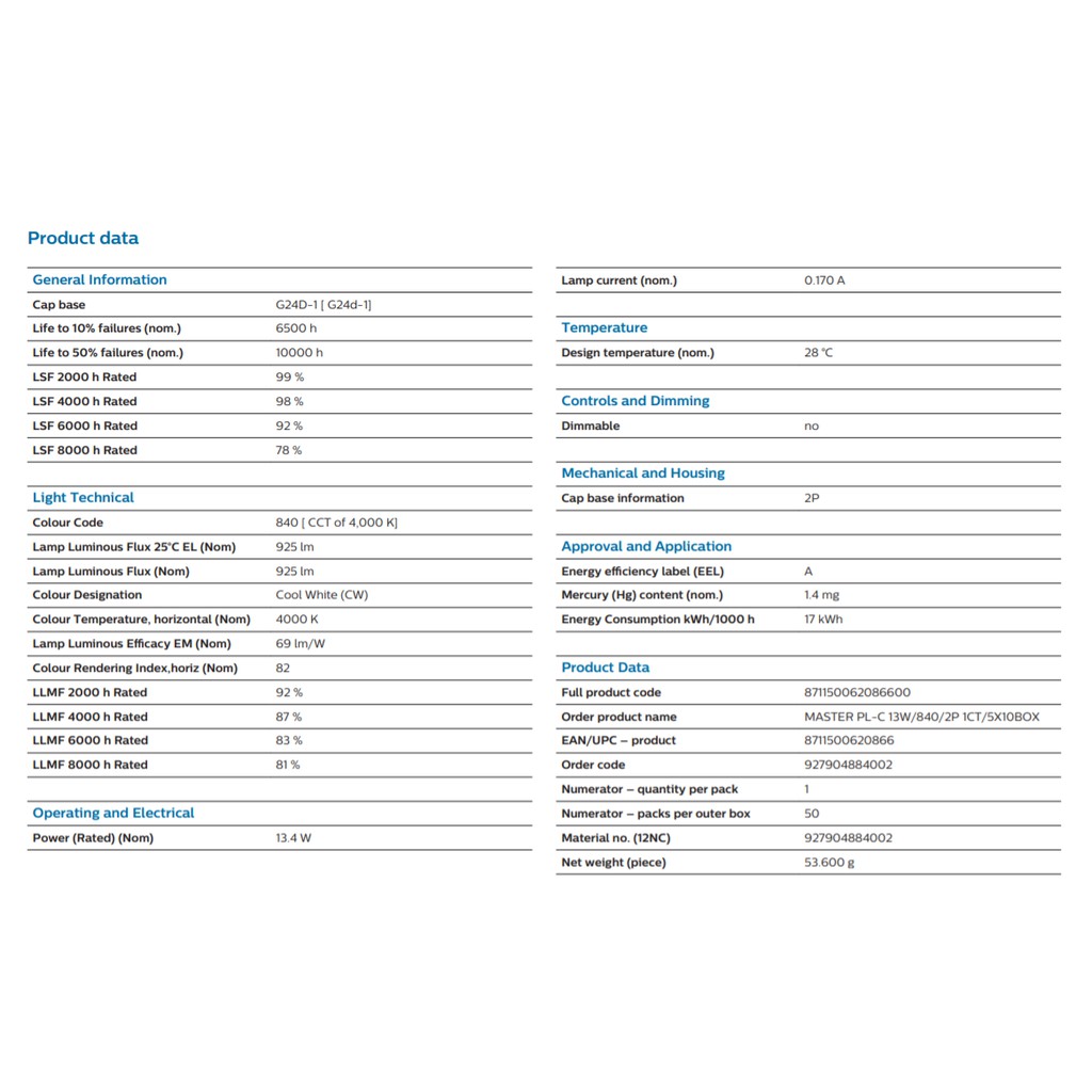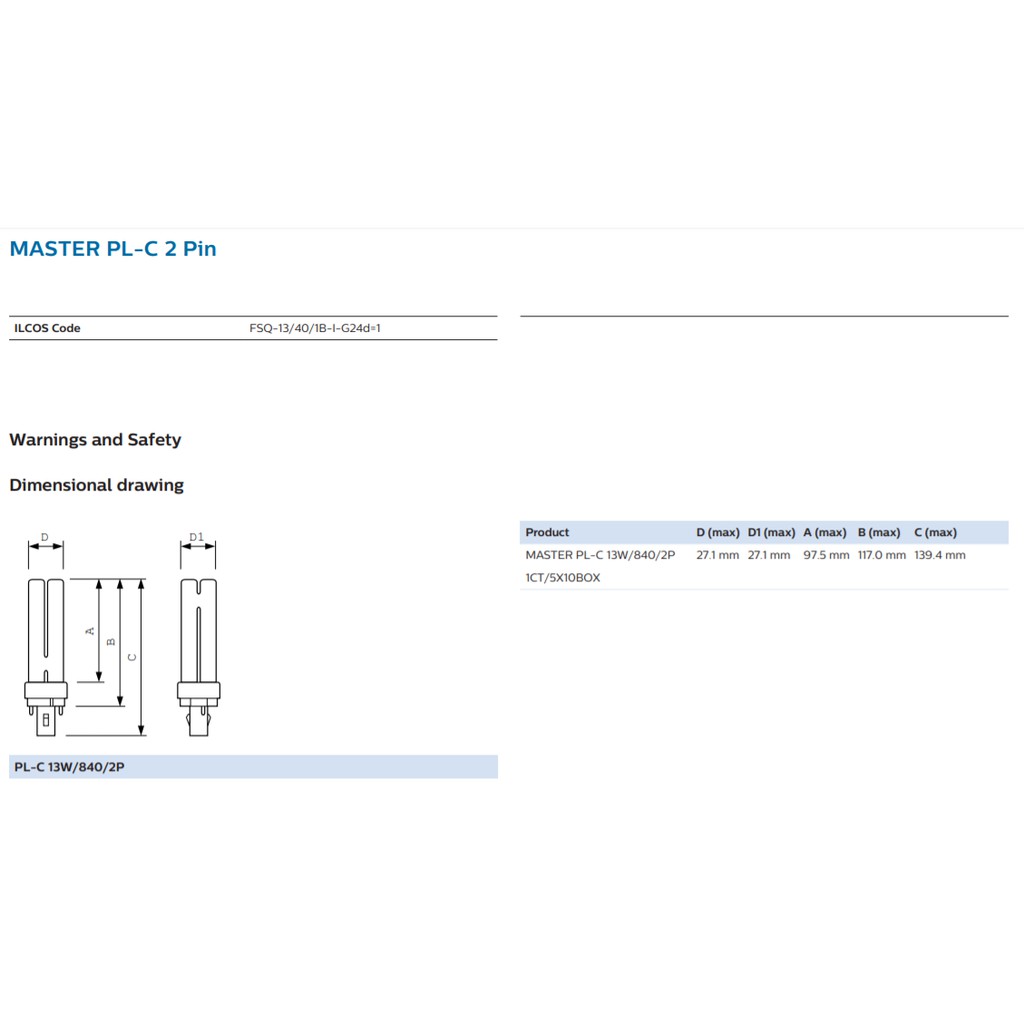 Philips Master PL-C / PLC 2 Pin 2P 13W 18W Light Tube 827 830 840 865