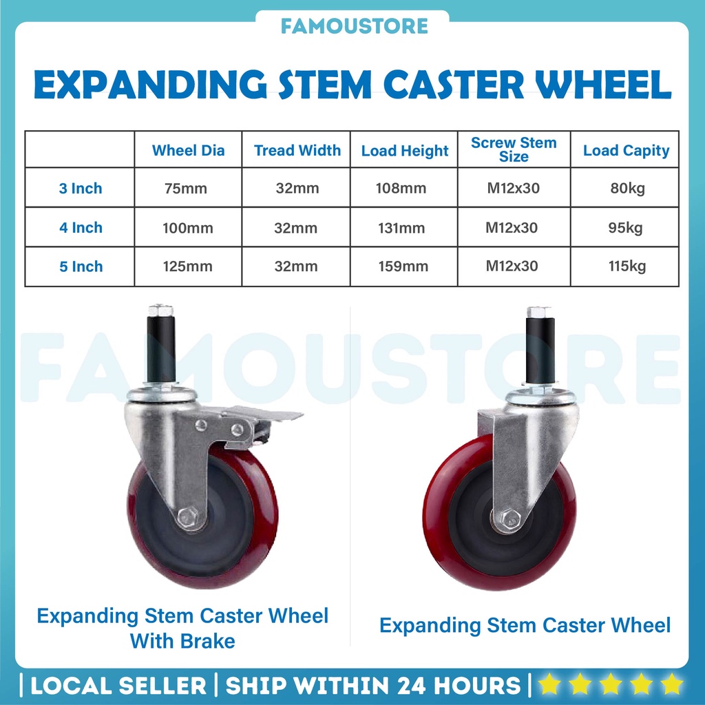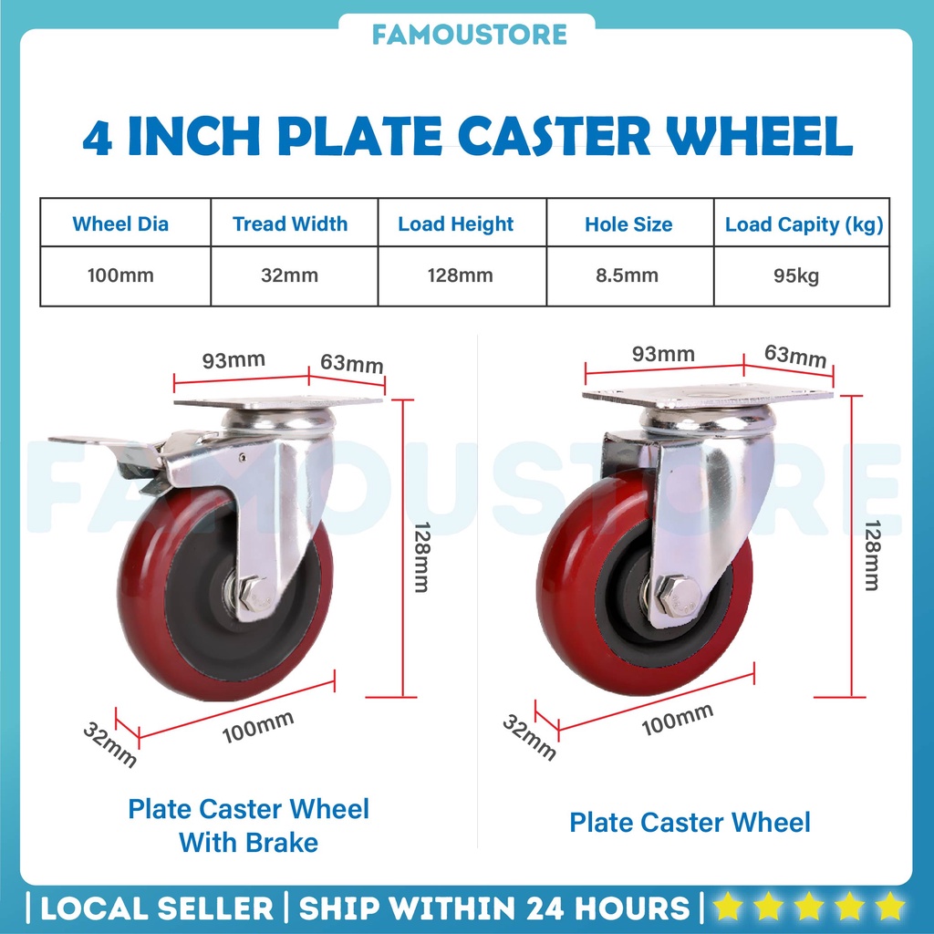 3"/4"/5" Heavy Duty Red TPU Swivel Brake Caster Roller Roda Trolley Wheel RIGID