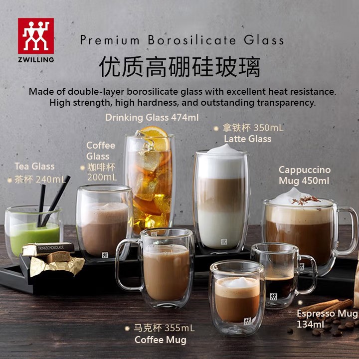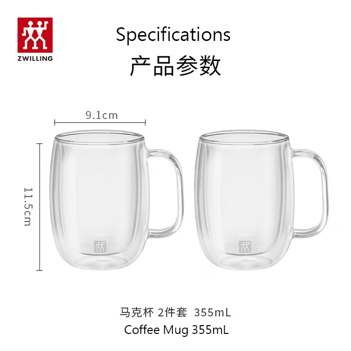 ZWILLING Sorrento Plus Set of 2 Coffee Cup with Handle 355ml / 12oz, Double Wall Borosilicate Glass