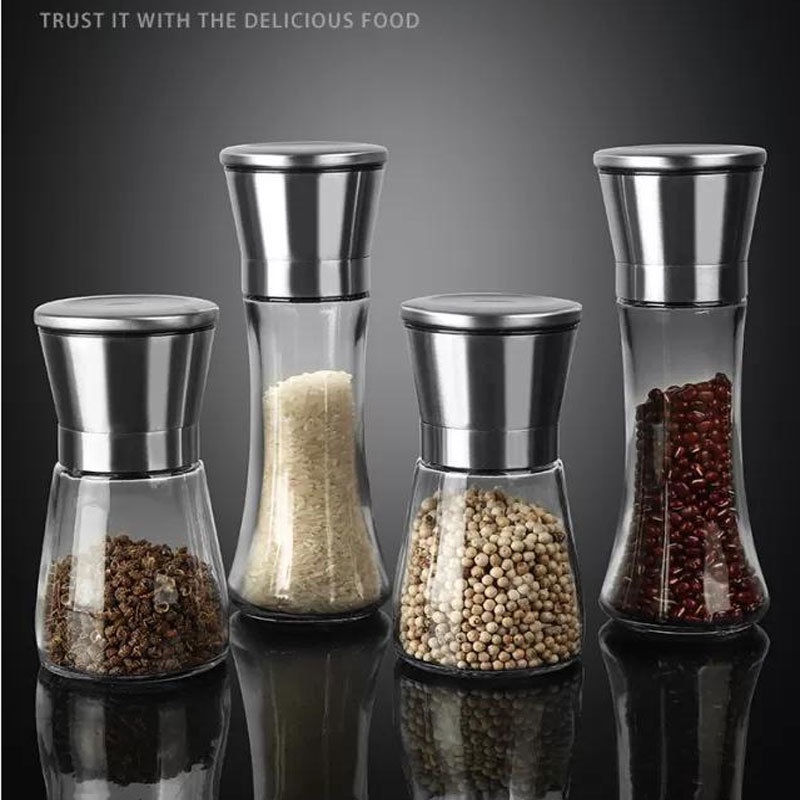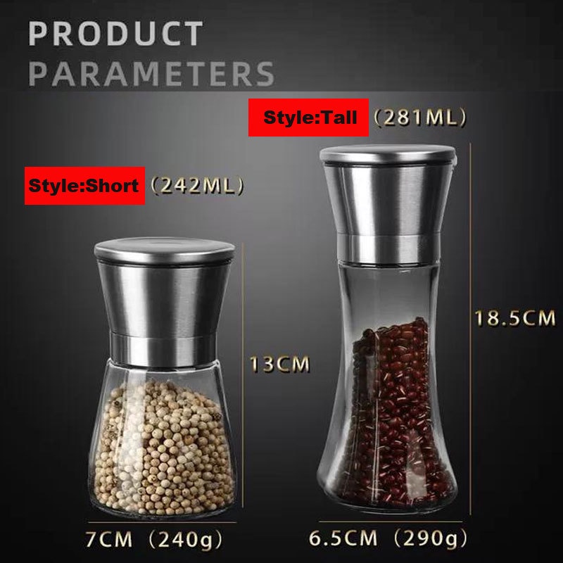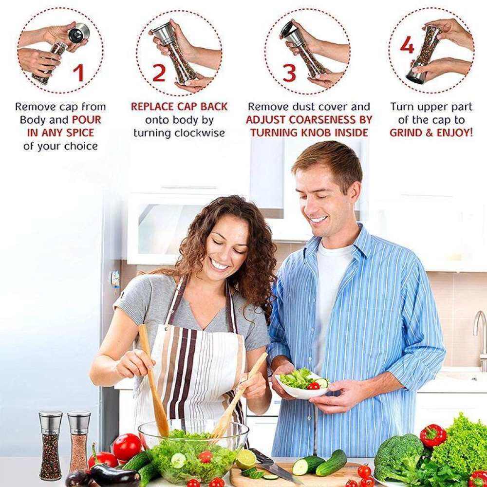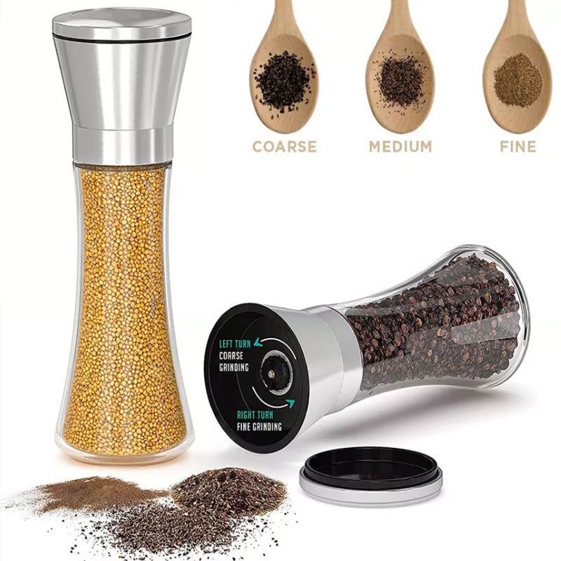 Salt and Pepper Mill Shakers, Stainless Steel Manual Sea Salt Mills, Adjustable Ceramic Pepper Grinder with Glass Body