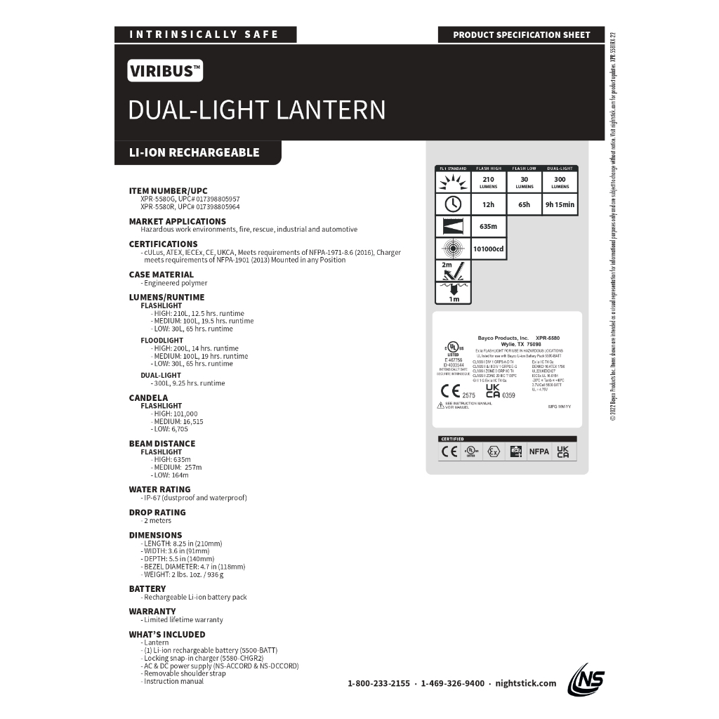 Nightstick, Zone 0, 5580G, Viribus® 80 Intrinsically Safe Rechargeable Dual-Light™ Lantern