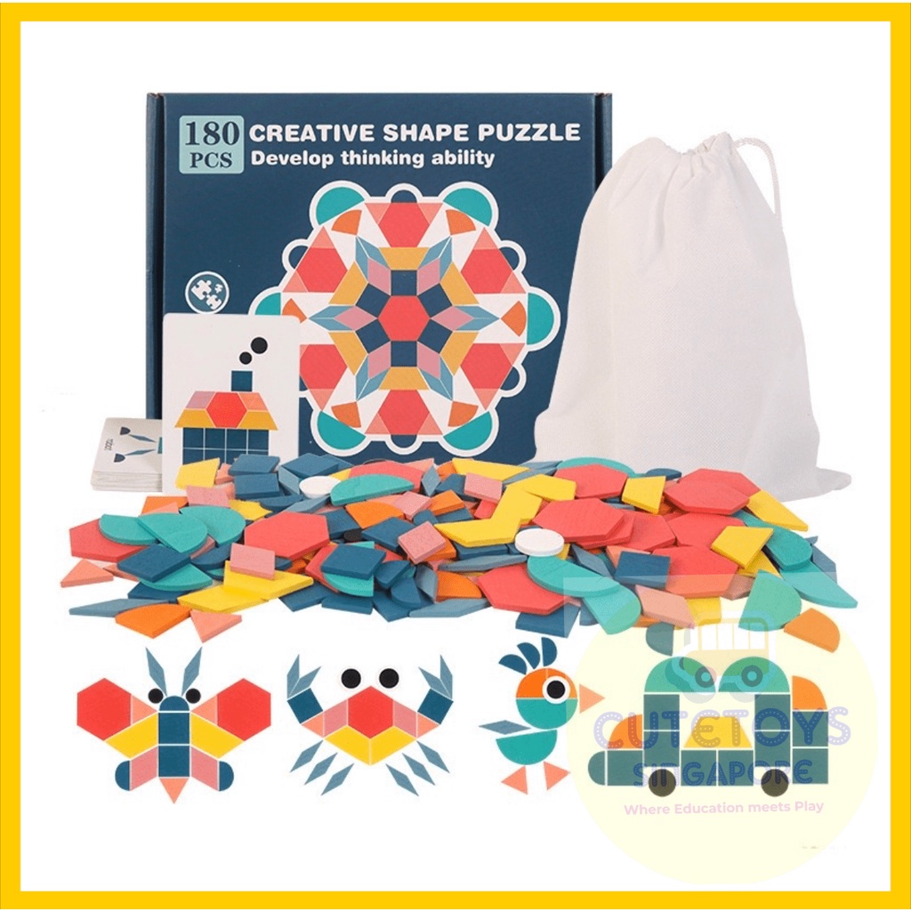 [SG STOCKS] 180 Pieces Montessori Morandi Wooden Shape Puzzle (24 Design Card / Early Geometry Pattern Block Creativity)