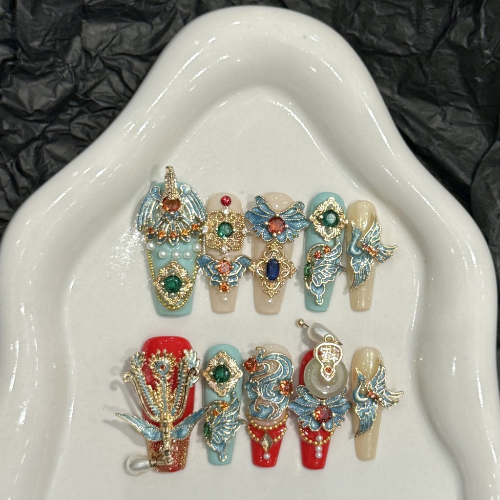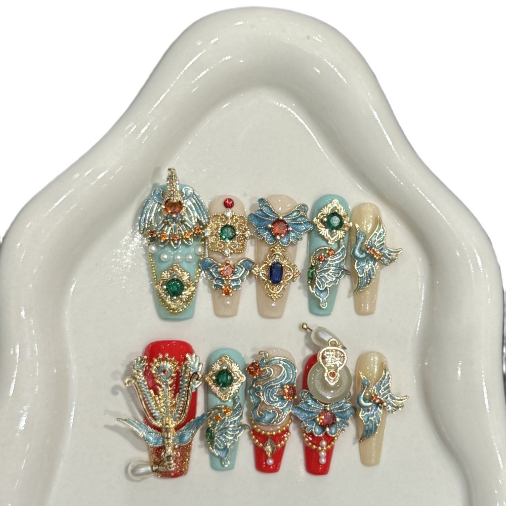 [5in1 Toolkit+HANDMADE]Dragon Phoenix Wedding Nail Art Long Trapezoid Fake Nails With Glue Phototherapy Nails Press On Nails Reusable Waterproof