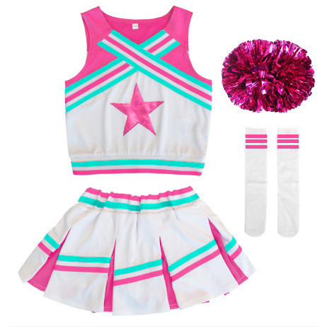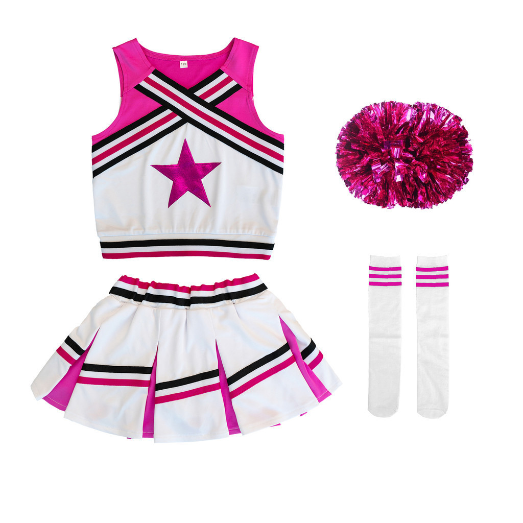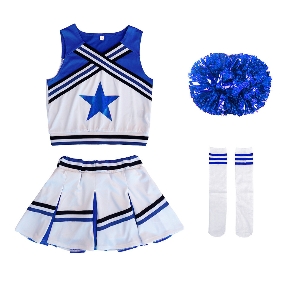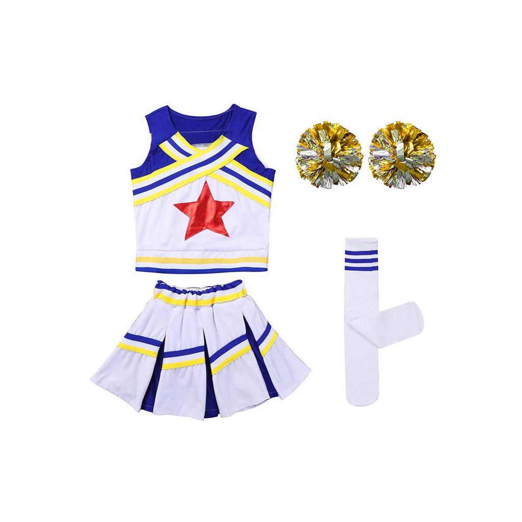 4Pcs Girls Cheerleader Uniform Outfit with Pom Poms&Socks Costume School Activities Performance Outfits 4-16 Years Blue Red Purple Pink