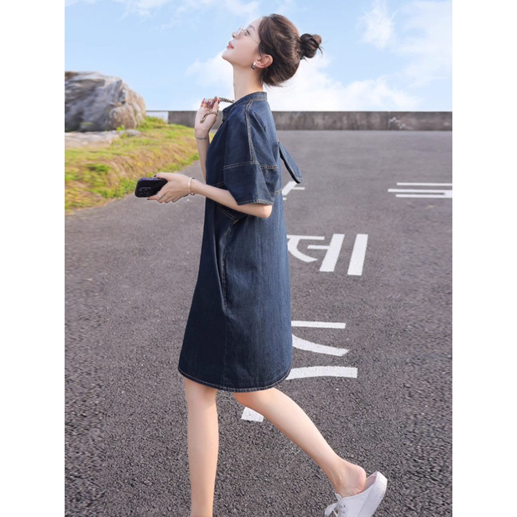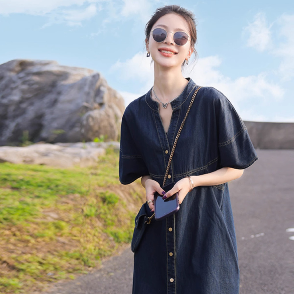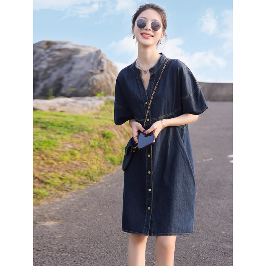Women's plus size short sleeve denim dress work office stand-up collar button down loose midi dresses