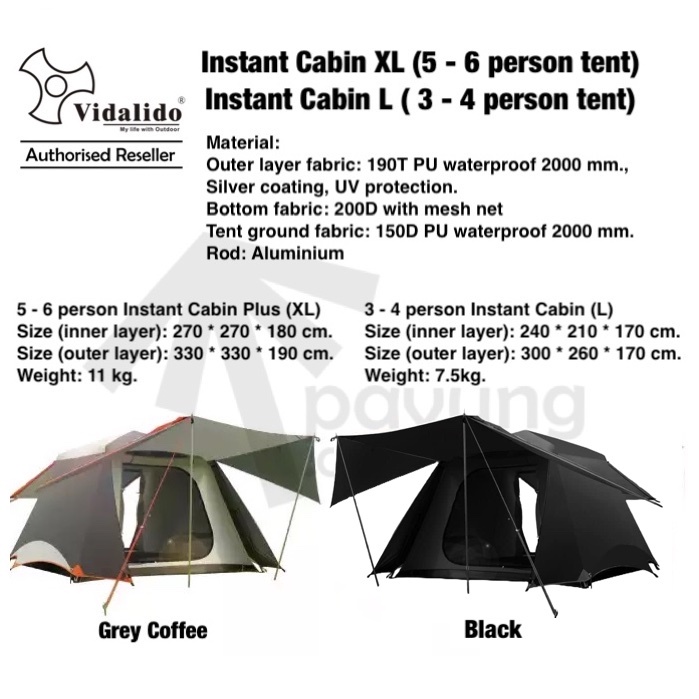 VIDALIDO Automatic Instant Cabin L / Cabin Plus Cabin XL Waterproof UV Protection Aluminium Rod Camping Tent Auto Tent