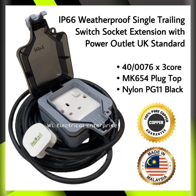 IP66 Weatherproof Single Trailing Switch Socket Extension With Cover Ingress Protection 13A 250V DIY Outdoor Gardening Switch Cover Socket
