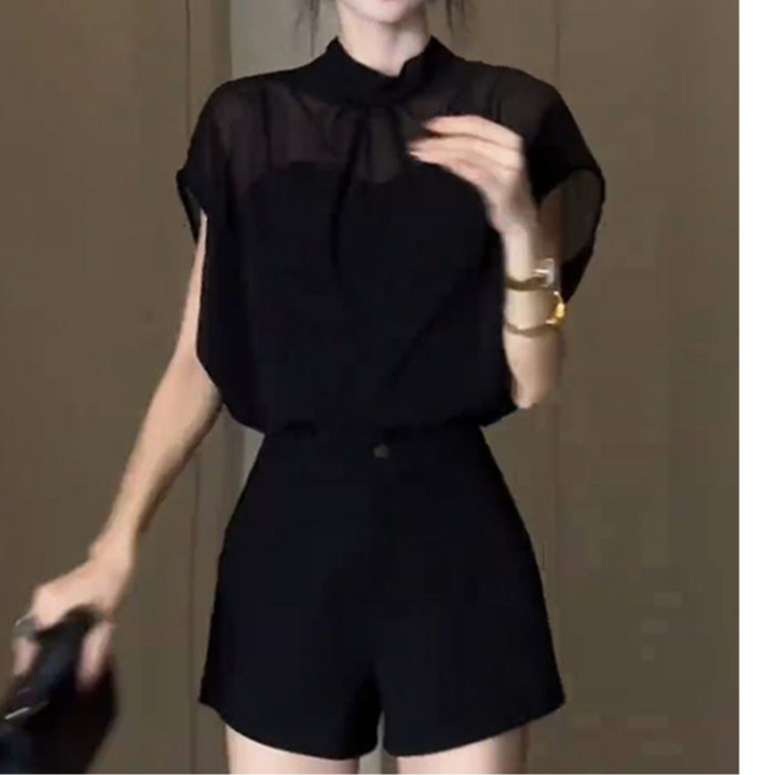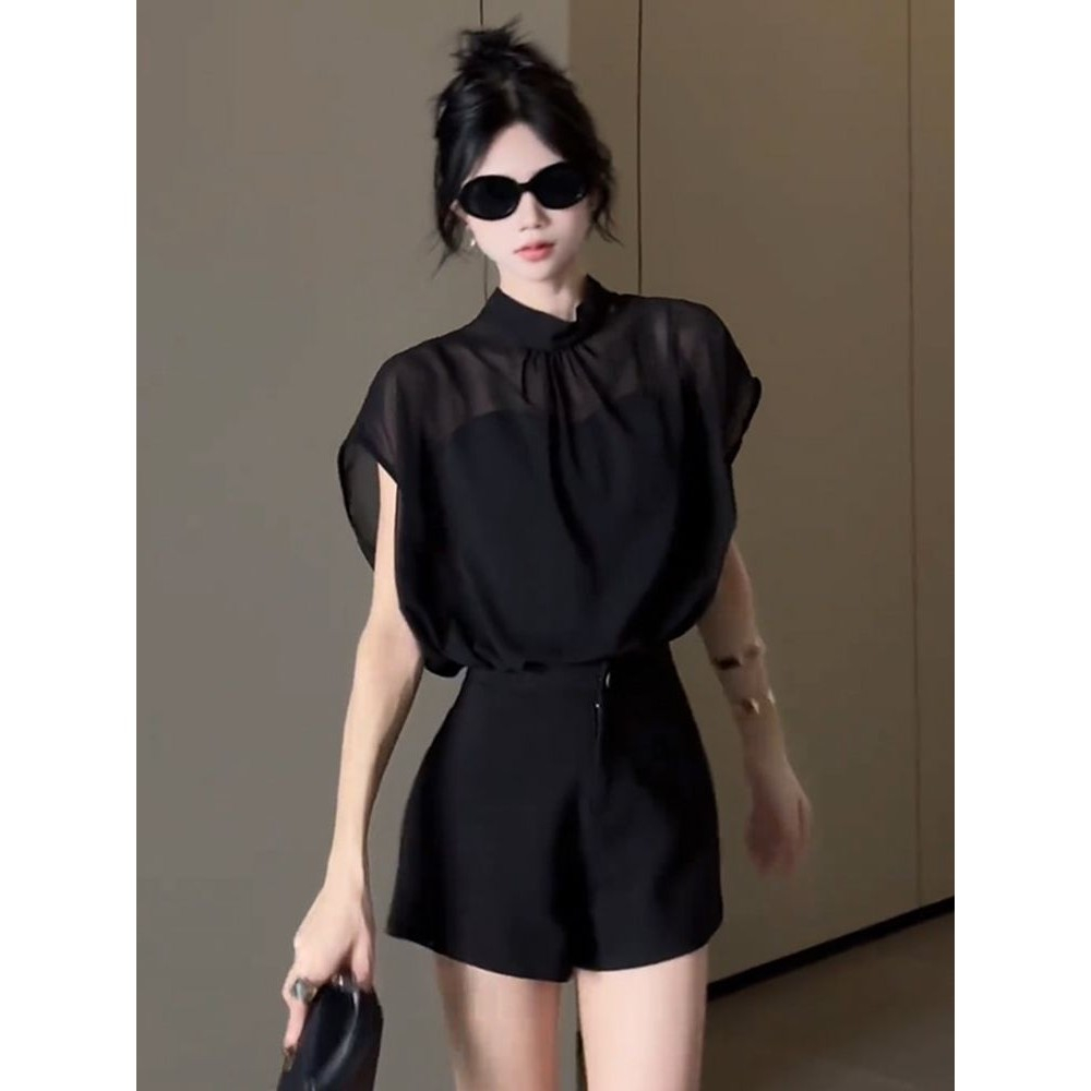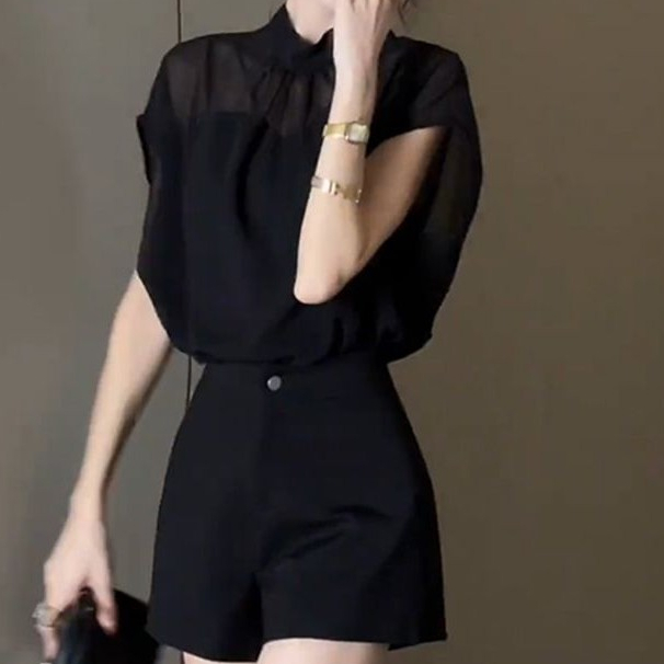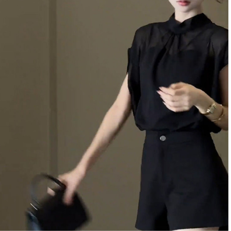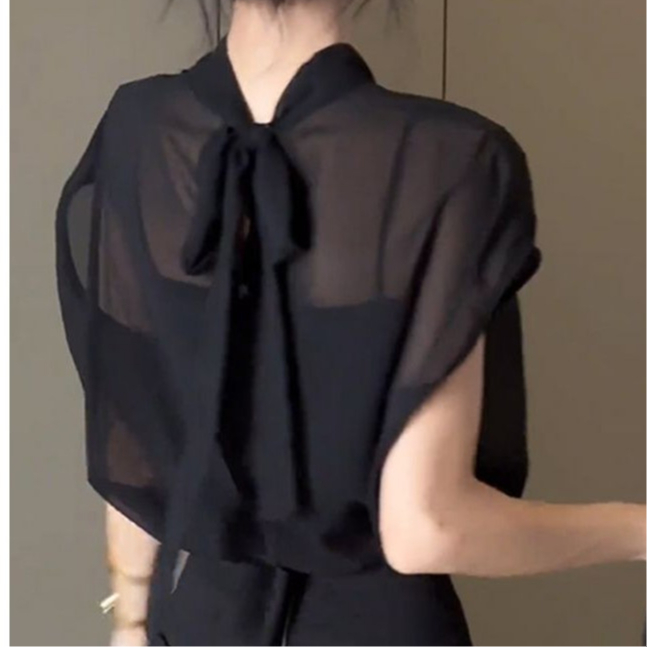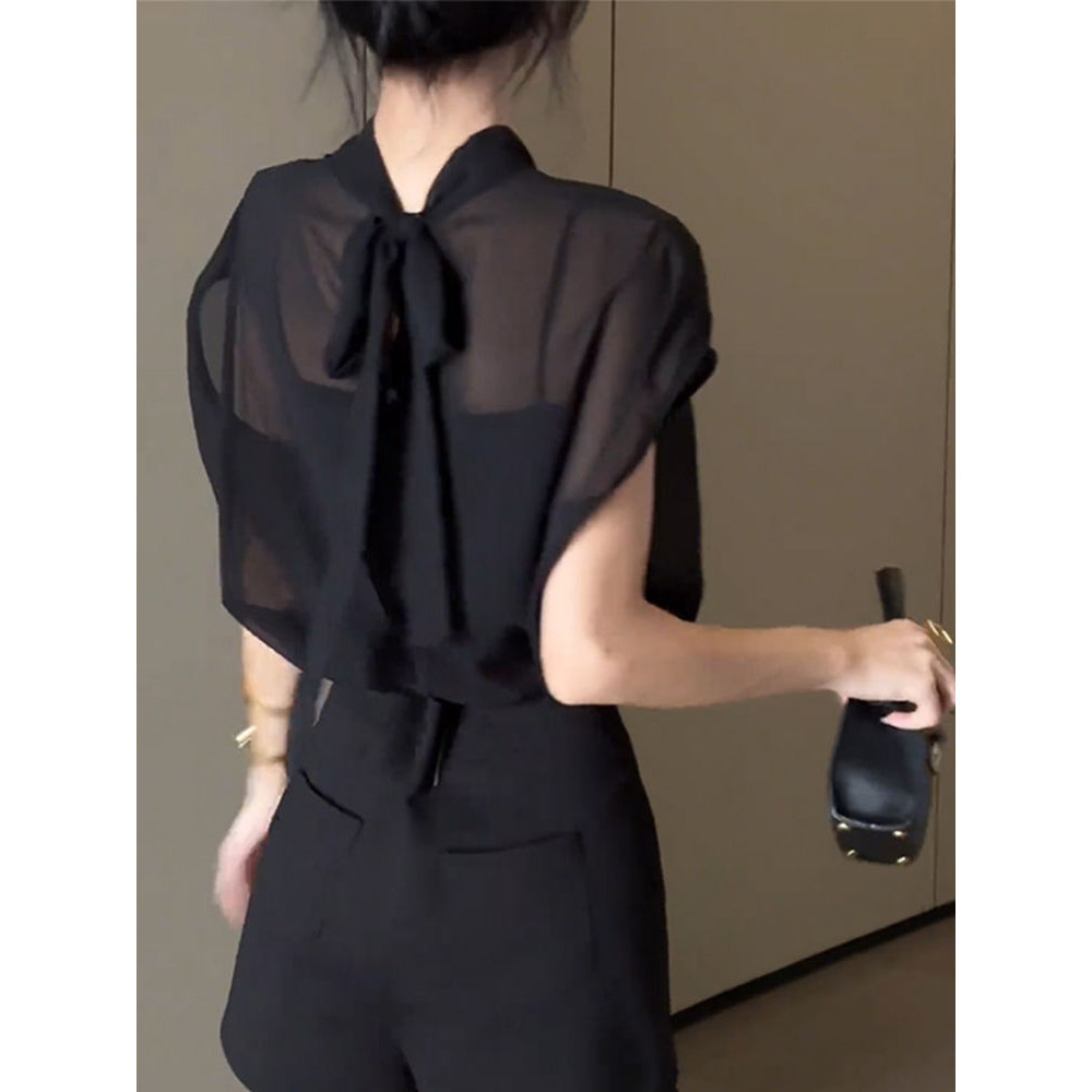 法式立领透视雪纺衫女优雅设计感宽松后绑带百搭上衣 Black Chiffon Elegant Blouse Women