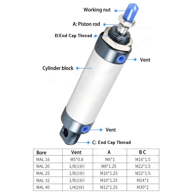 Air Pneumatic Cylinders Double Compressed Air Cylinder MAL Mini Bore 16/20/25mm Stroke 25/50/75/100 200 Single Lever