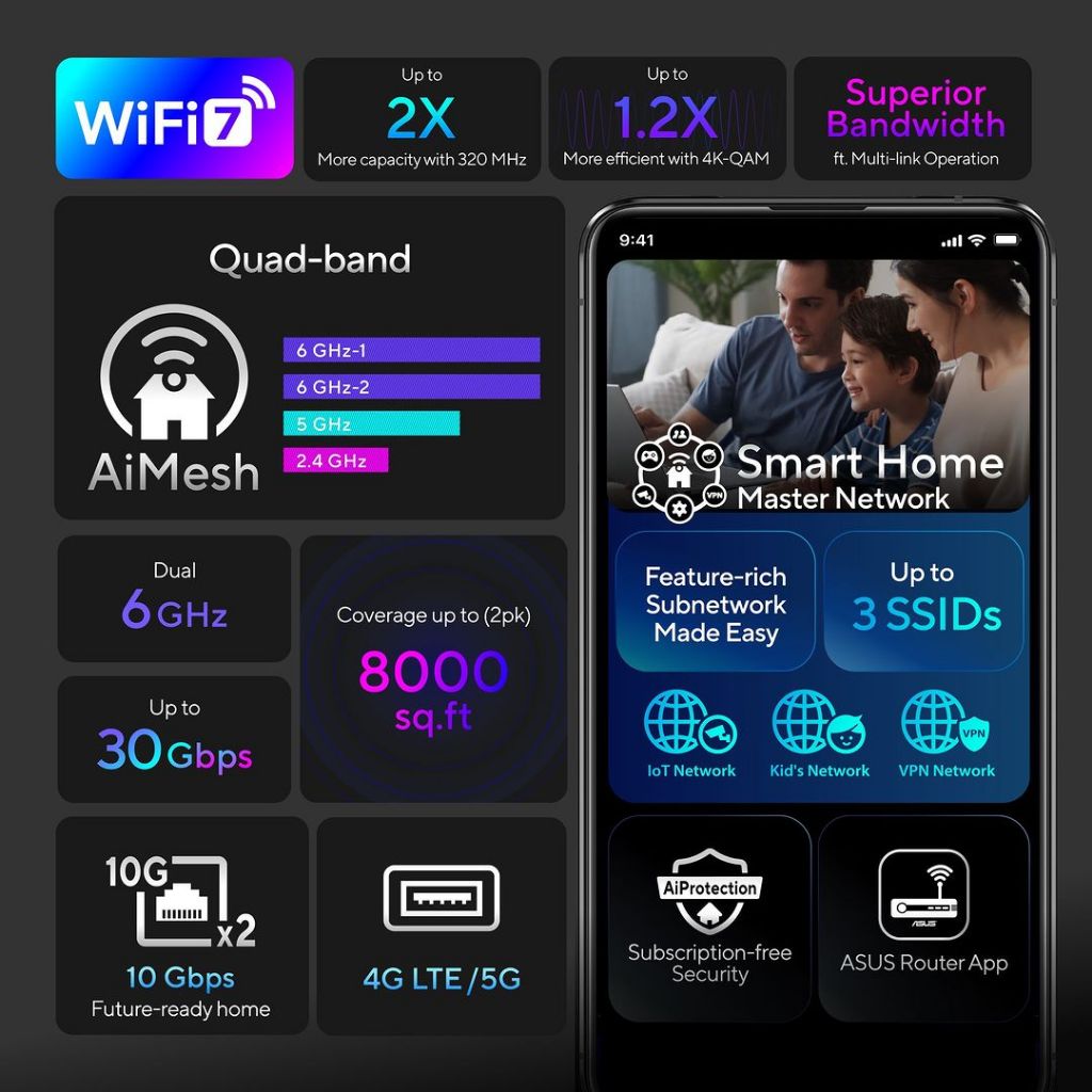ASUS ZenWiFi BQ16 Quad Band WiFi 7 BE25000 Mesh WiFi Router - coverage up to 8000 sq.ft, Dual 10G Port, AiMesh