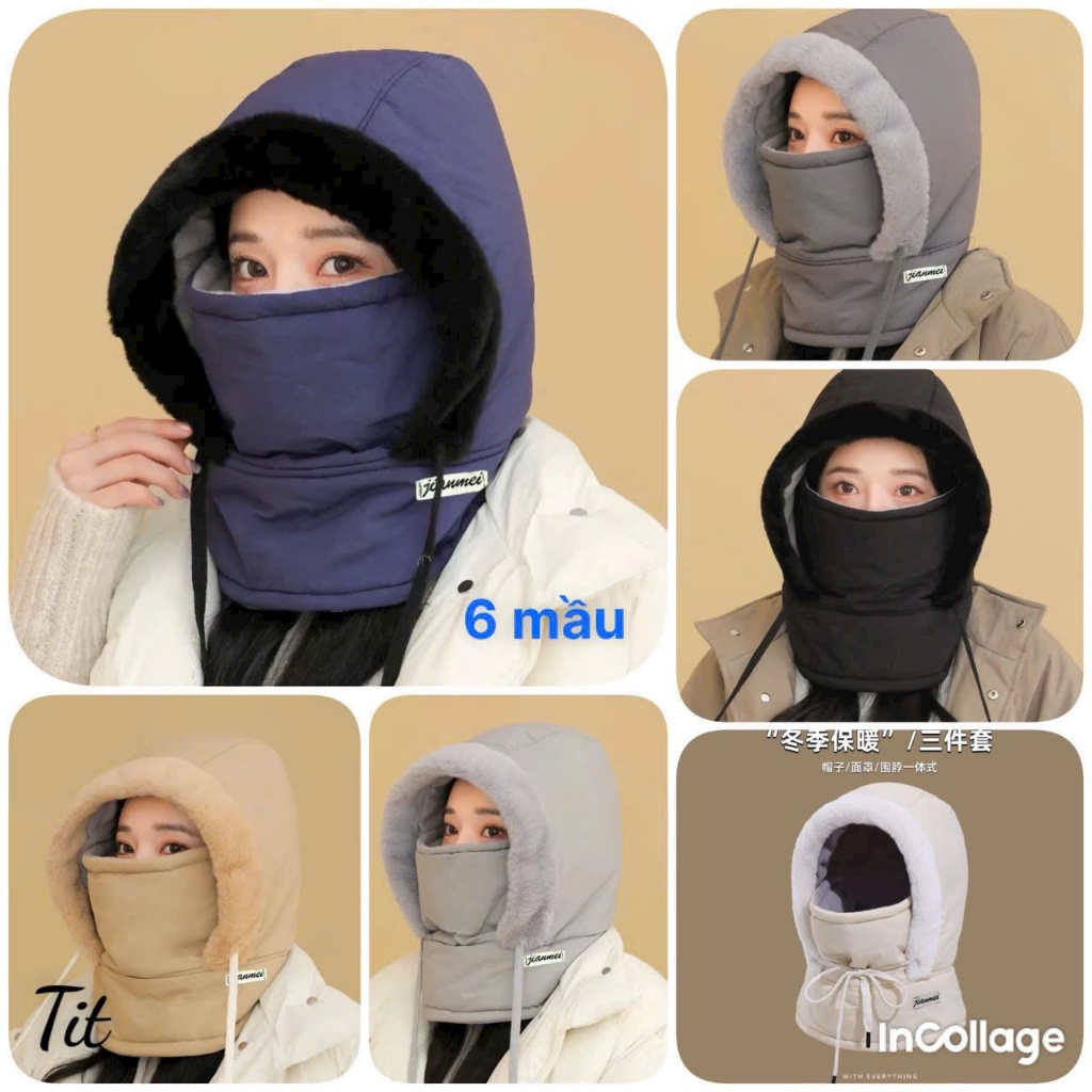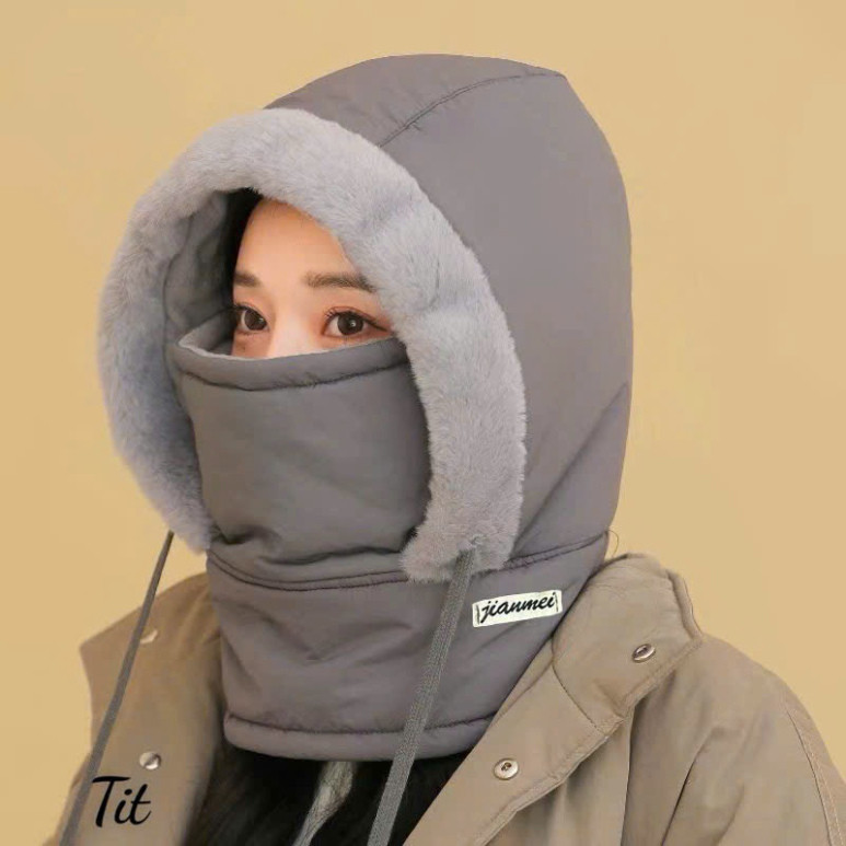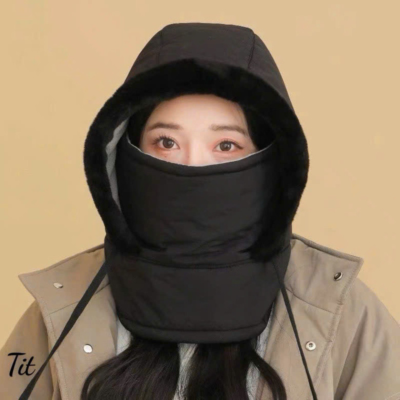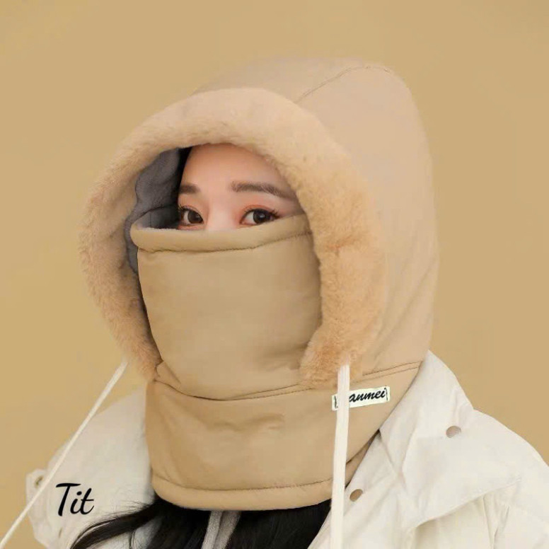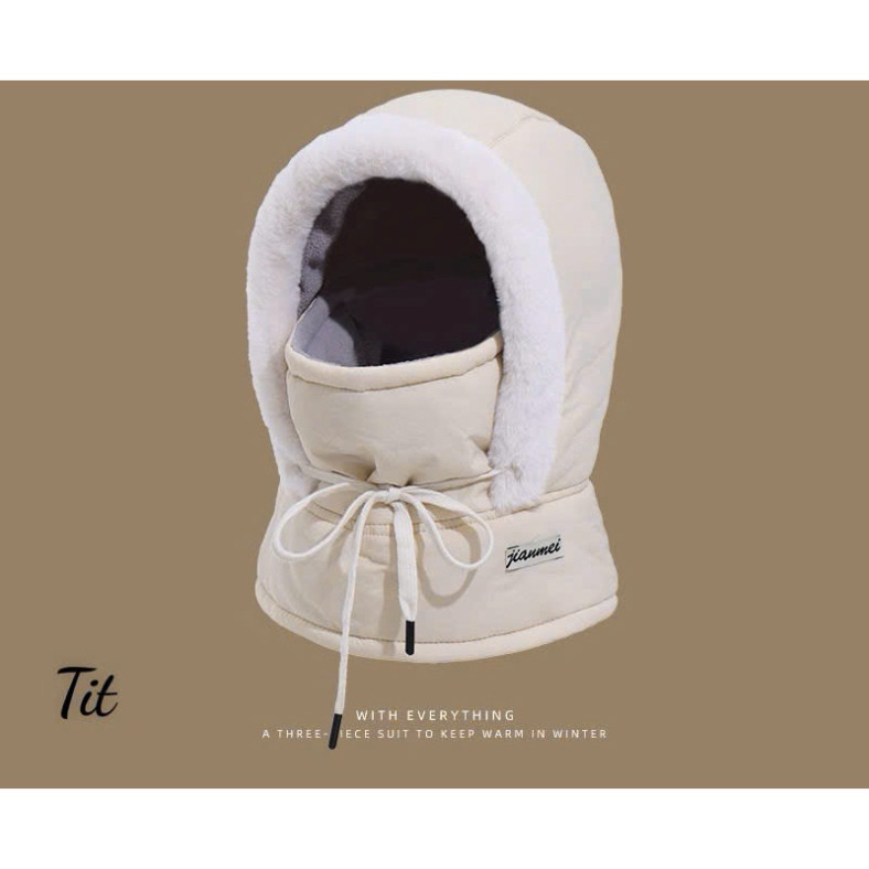Fur-Lined Hooded Hat Waterproof Cold-Proof Hat with Drawstring with Mask and Scarf
