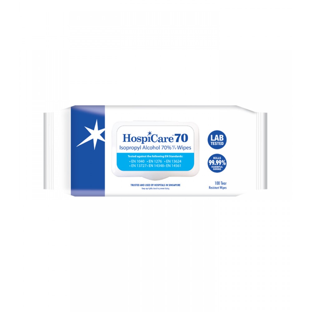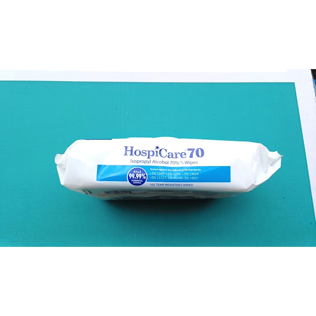 HospiCare 70% Isopropyl Alcohol Wipes 100 Sheets Resealable Pack Tear Resistant, Lab Tested Kills 99.99% Harmful Germs