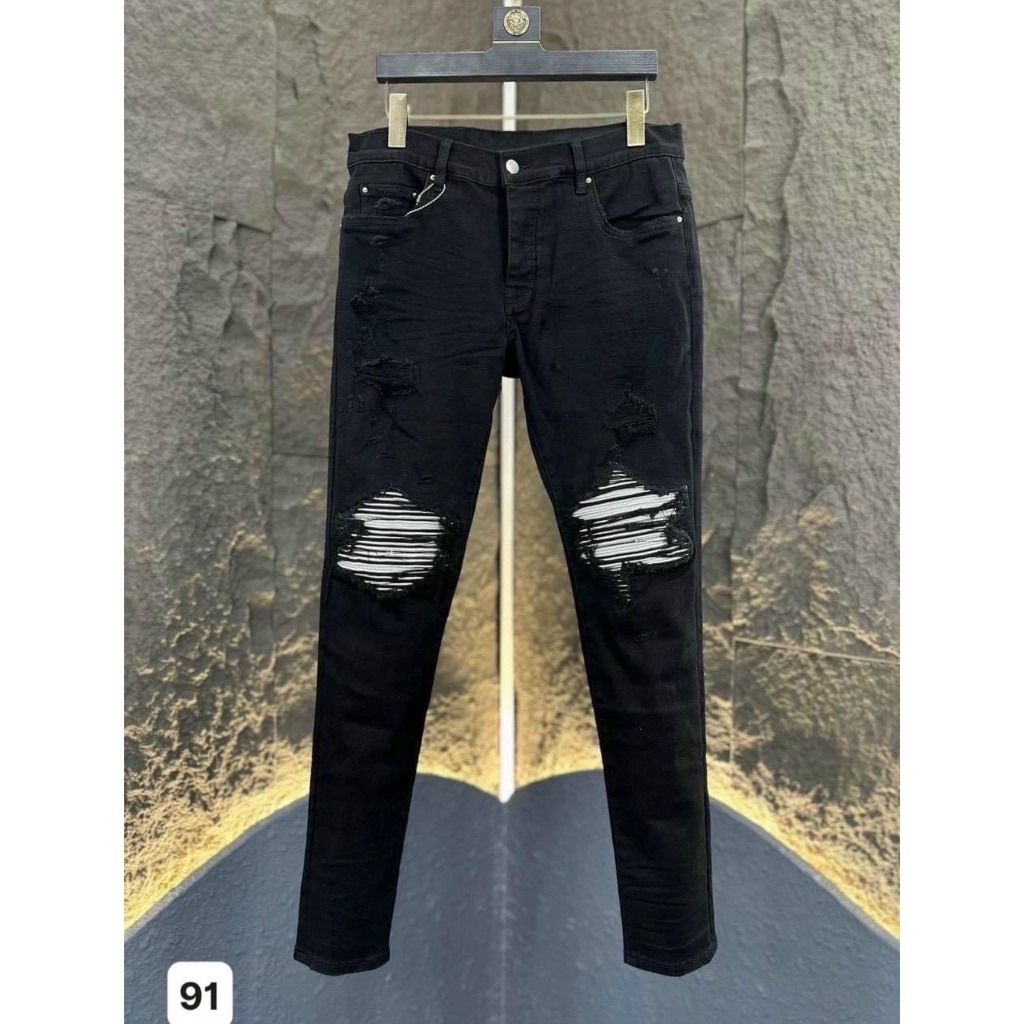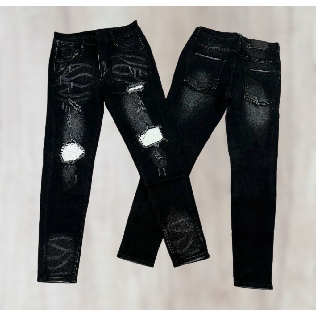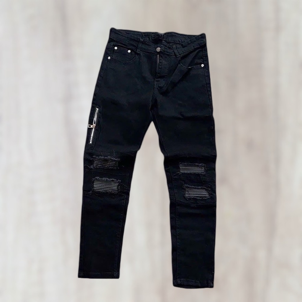 Code QJ48 Men's high-quality torn and patched leather jeans in BLACK with white leather patches, 4-way stretch denim material as shown in the standard picture from.