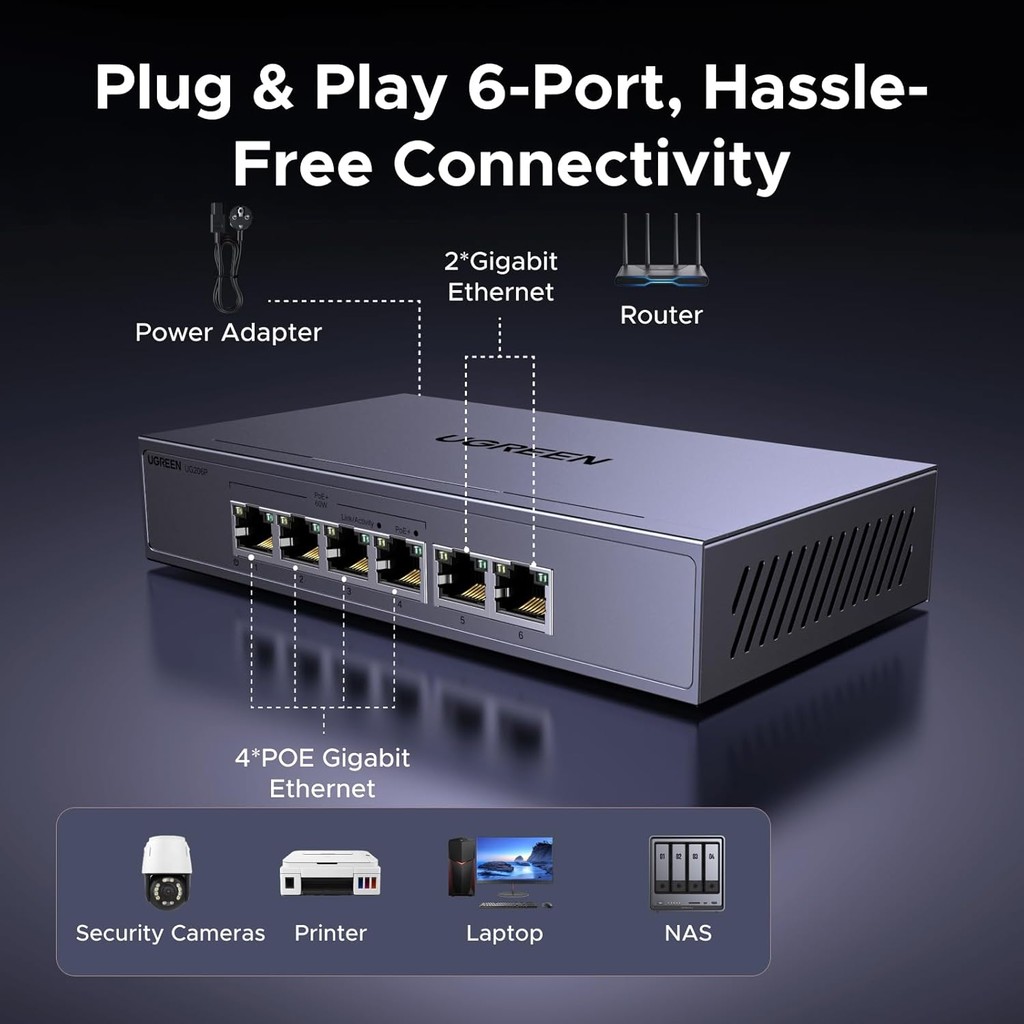 UGREEN POE Network Switch,4x Gigabit PoE+ Ports& 2 Gigabit Auto ports Ethernet Splitter , 802.3af/at 30W,60W Total Budge