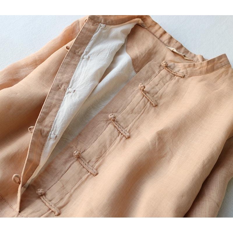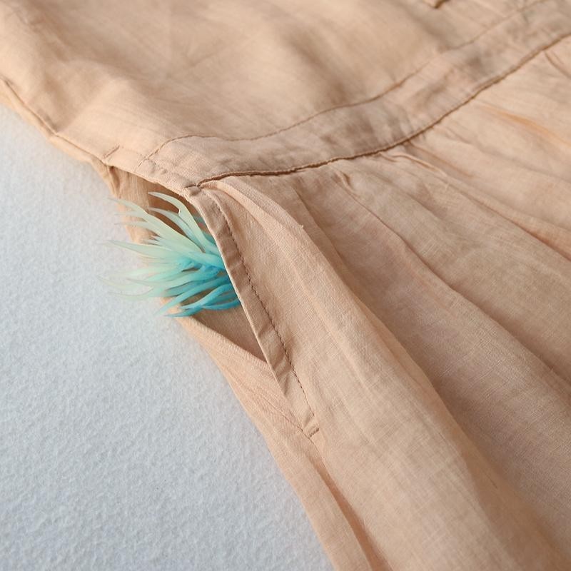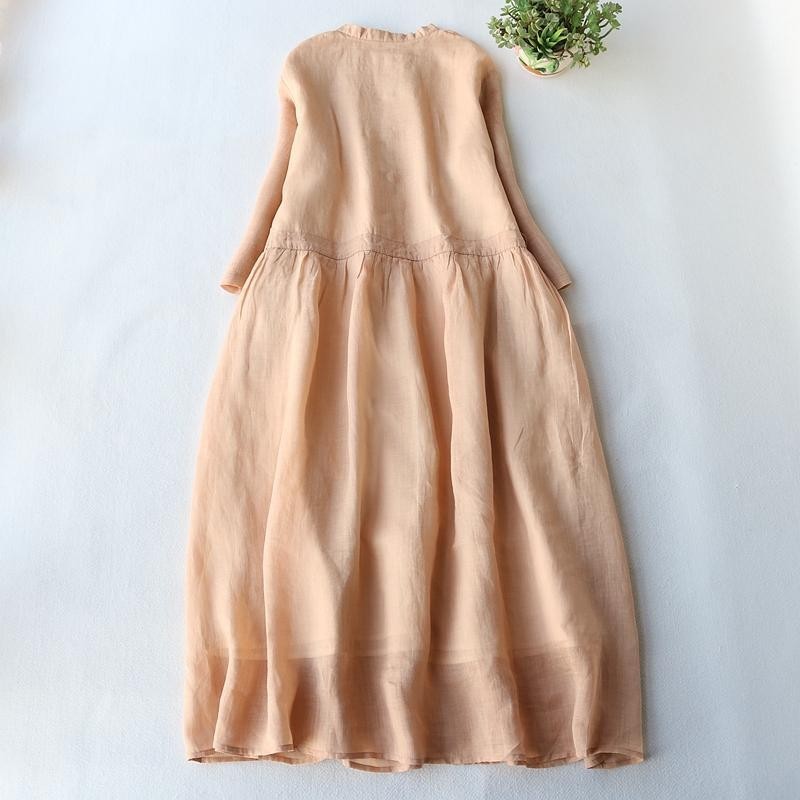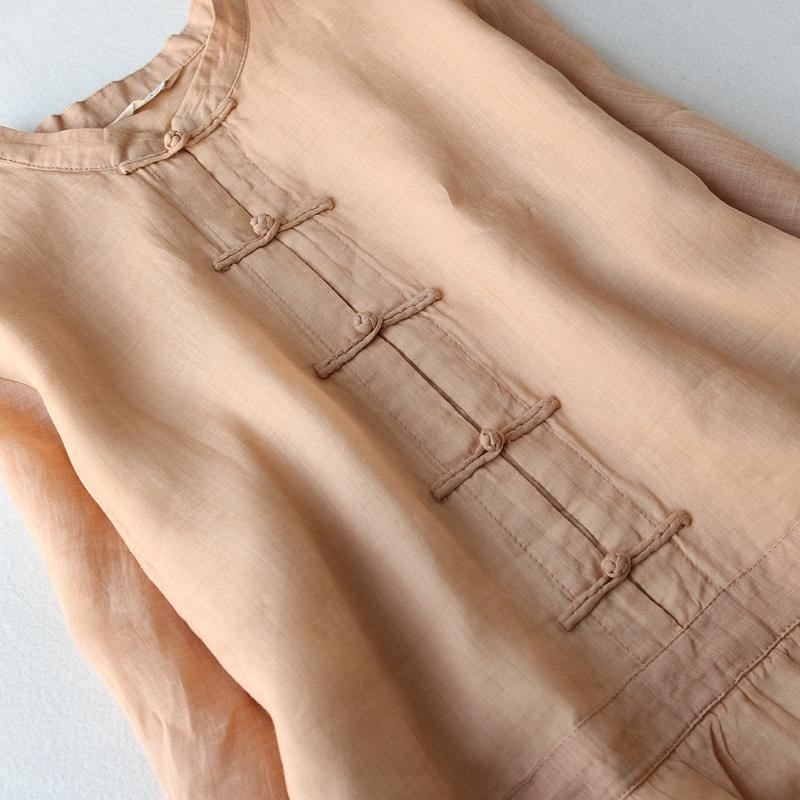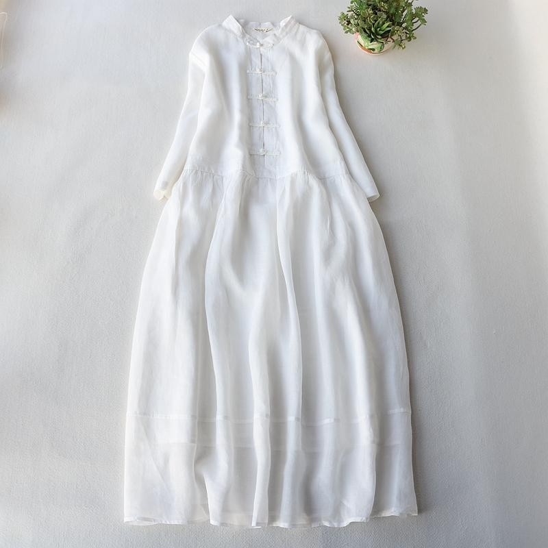 Cotton and Linen Dress Stand-up Collar 3/4 Sleeve Vintage Buckle Slimming Dress