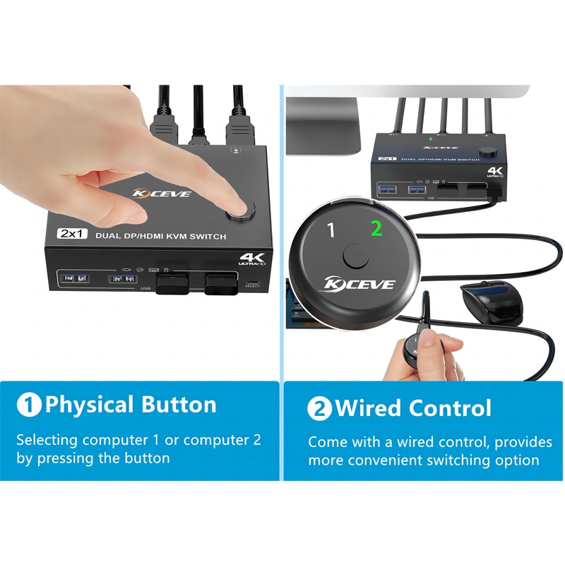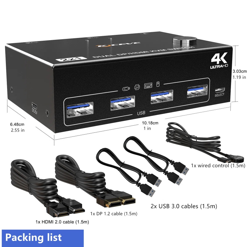 DP HDMI USB 3.0 KVM Switch, Dual Monitors Displayport KVM Switcher Supports 4K@60Hz for 2 Computers 2 Monitors