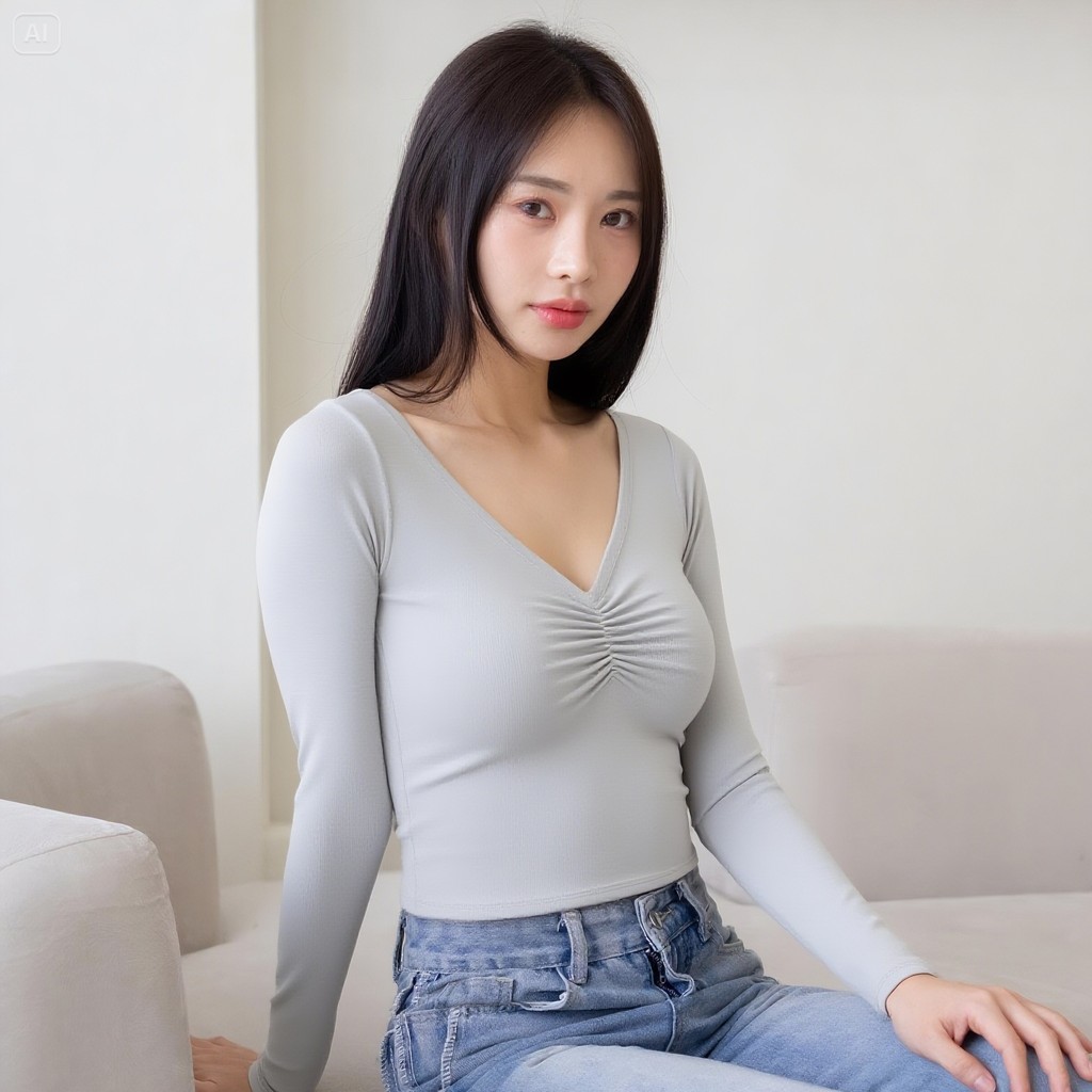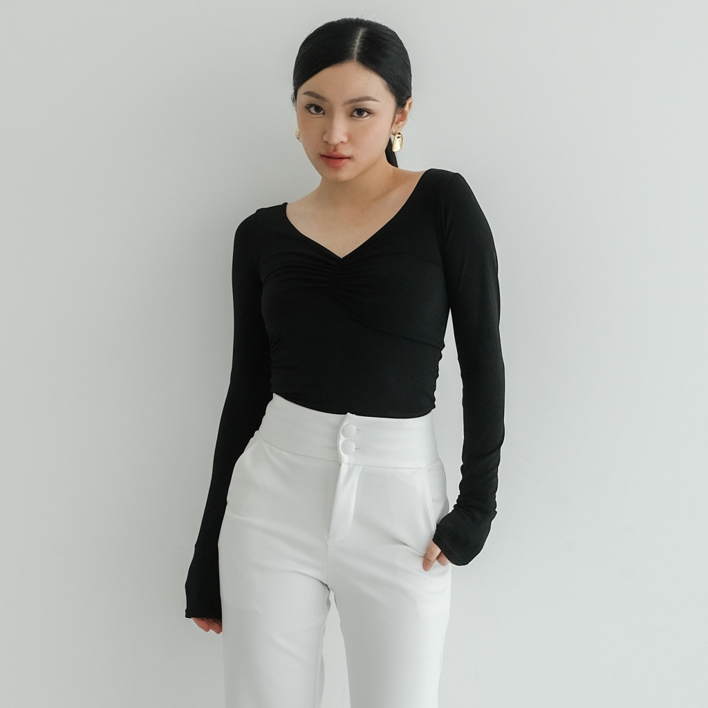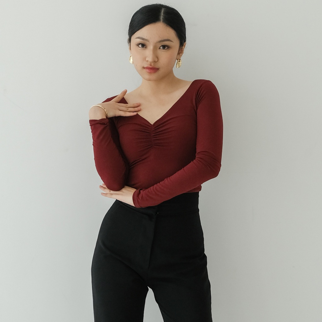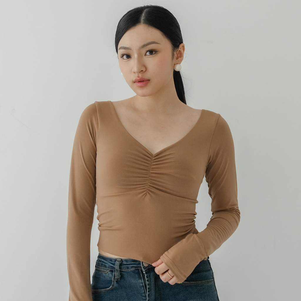 NZINGA Nari | Women's Plain Long Sleeve Top - V Neck Ruched Slim Fit Shirt | Size S - XXL