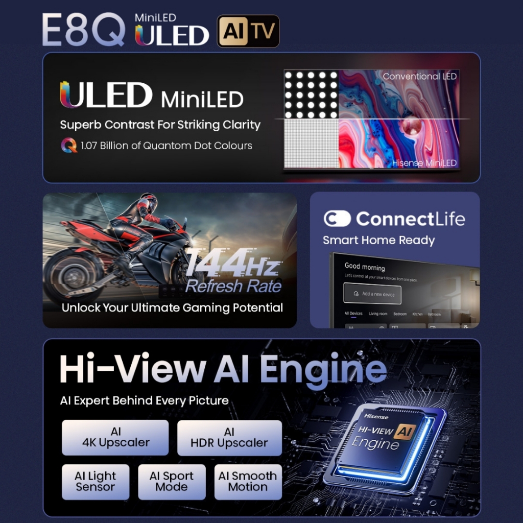 Hisense E8Q 55/65/75 inch 4K ULED Mini LED Max AI TV | Hi-View AI Engine | Native 144Hz Refresh Rate