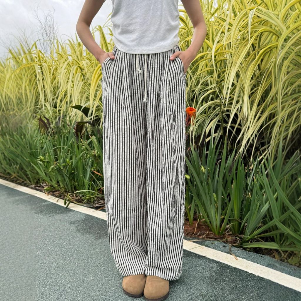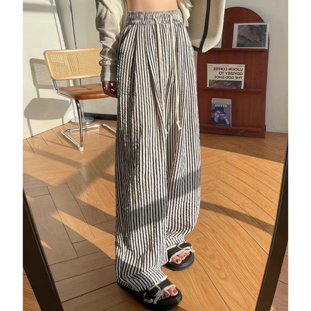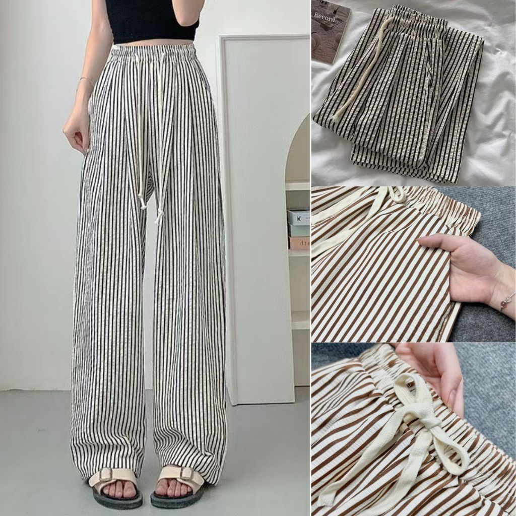 Women's big-size striped pants with wide leg, elastic waist, flattering striped fabric, cool to wear - Q534 Wide Leg Pants Women