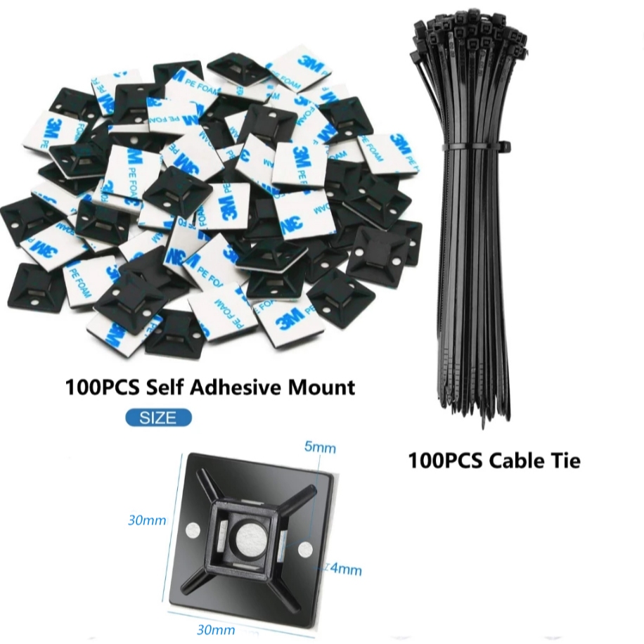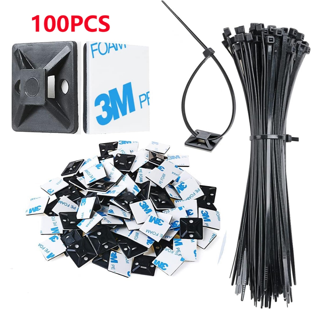 100 Pack 3M Back-Glue Self Adhesive White Strong Cable Zip Tie Mounts 100pcs with Ties, Outdoor Sticky Wire Fasteners Cable Clips Management Anchors Organizer Holders Squares