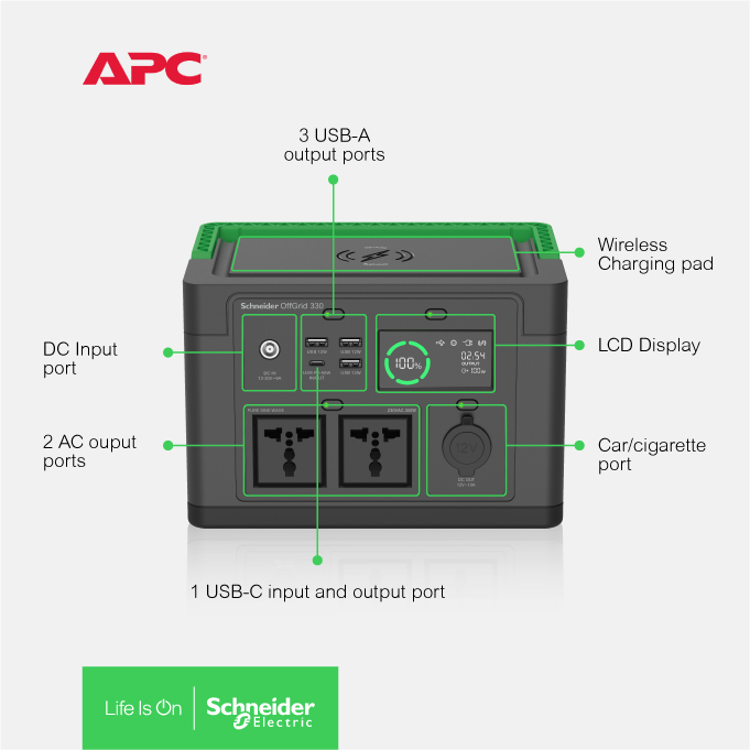 APC Schneider OffGrid Portable Power Station 330, 120V, 332Wh Lithium-ion, LCD, Wireless Charger, PPS330-MS