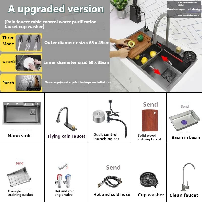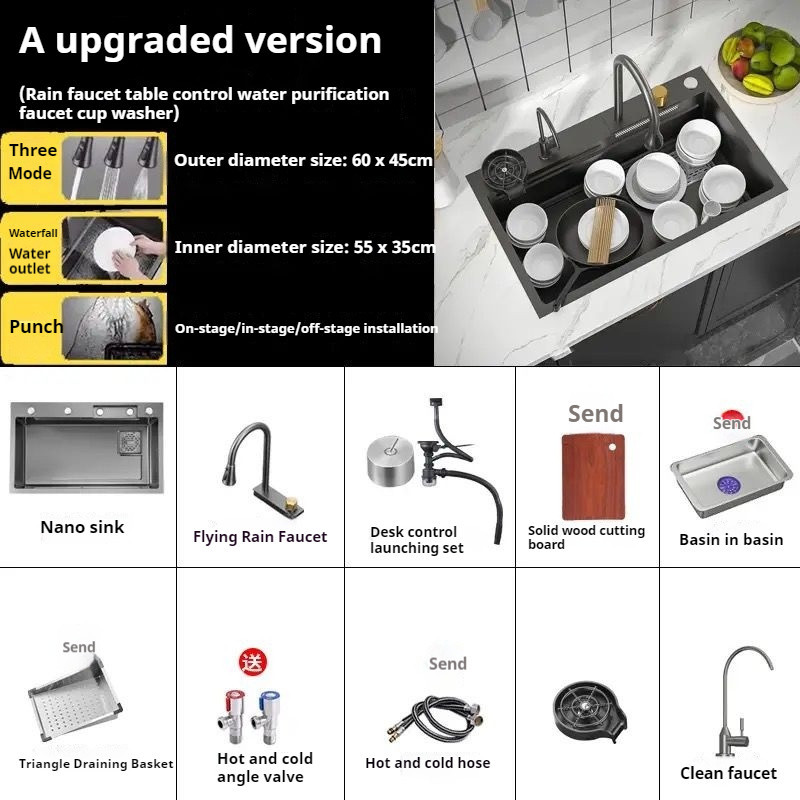 Kitchen Sink 304 Stainless Steel With Waterfall Single Basin Bowl Tank Pullout Faucet Tap Household Nano Wash Basin Drain Accessories QWER