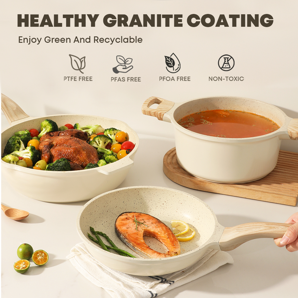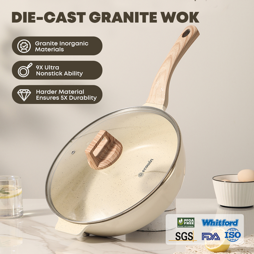 ecowin 24/28/30/32cm Non Stick Wok with Lid Granite Rock Wok Deep Frying Pan for Induction Cooker (NO PFAS, PTFE, PFOA)