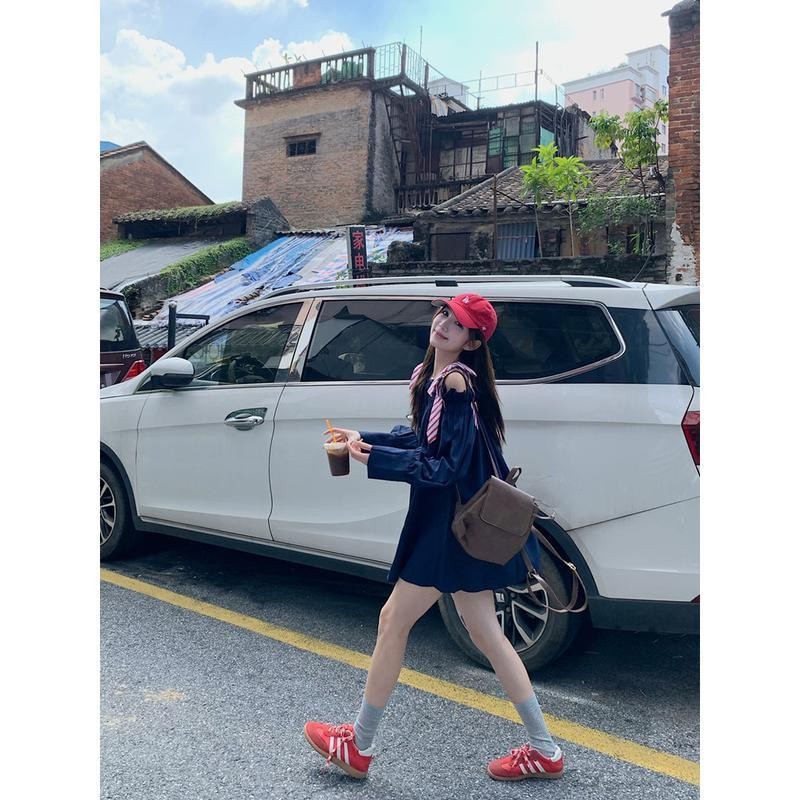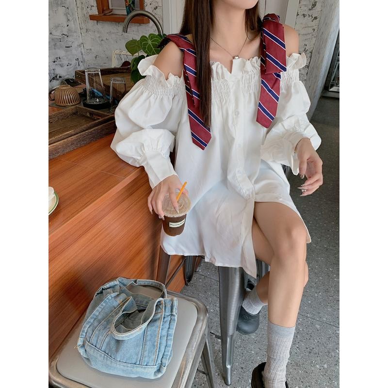 mimi&didi One-Shoulder Shirt Long Sleeves Korean Style New Design Contrasting Colors With Bow Spaghetti Strap Top For Women W633