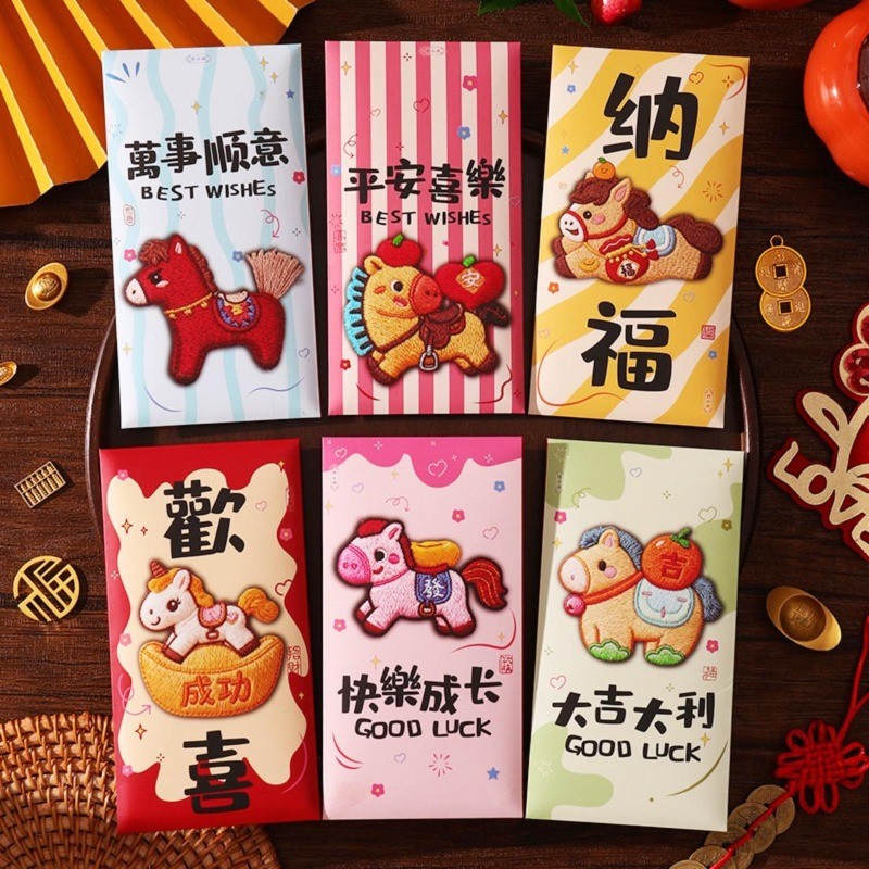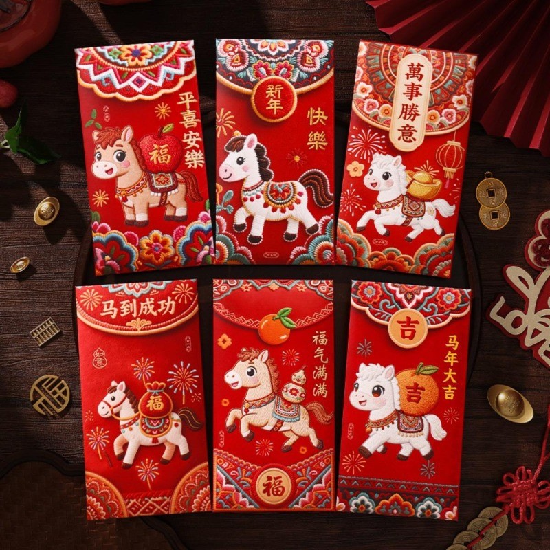 6Pcs/Set 2026 Horse New Year Embroidered Red Envelopes Chinese New Year Red Angpao CNY Red Packet Ampao Money Envelope Ang Pow Gift for Kids Family