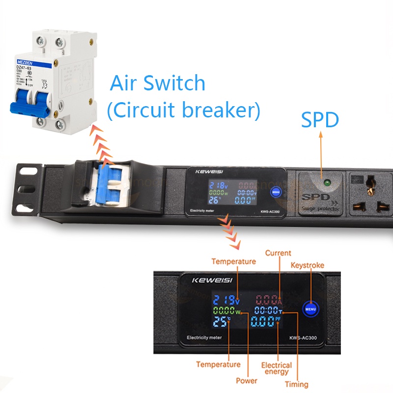 Power panel socket of high-power intelligent digital display power distribution unit (PDU), 16A/32A air switch with surge protection, without extension cable