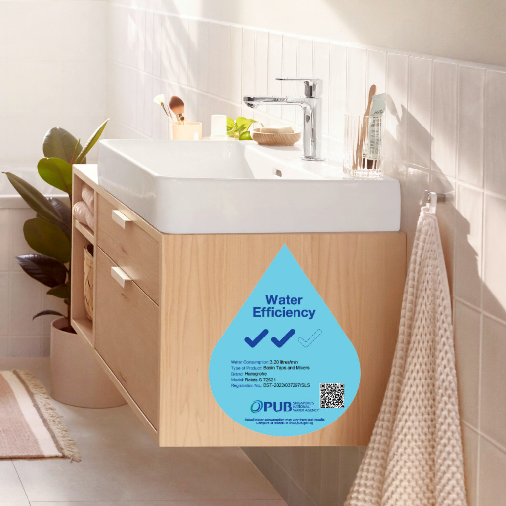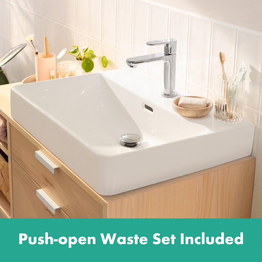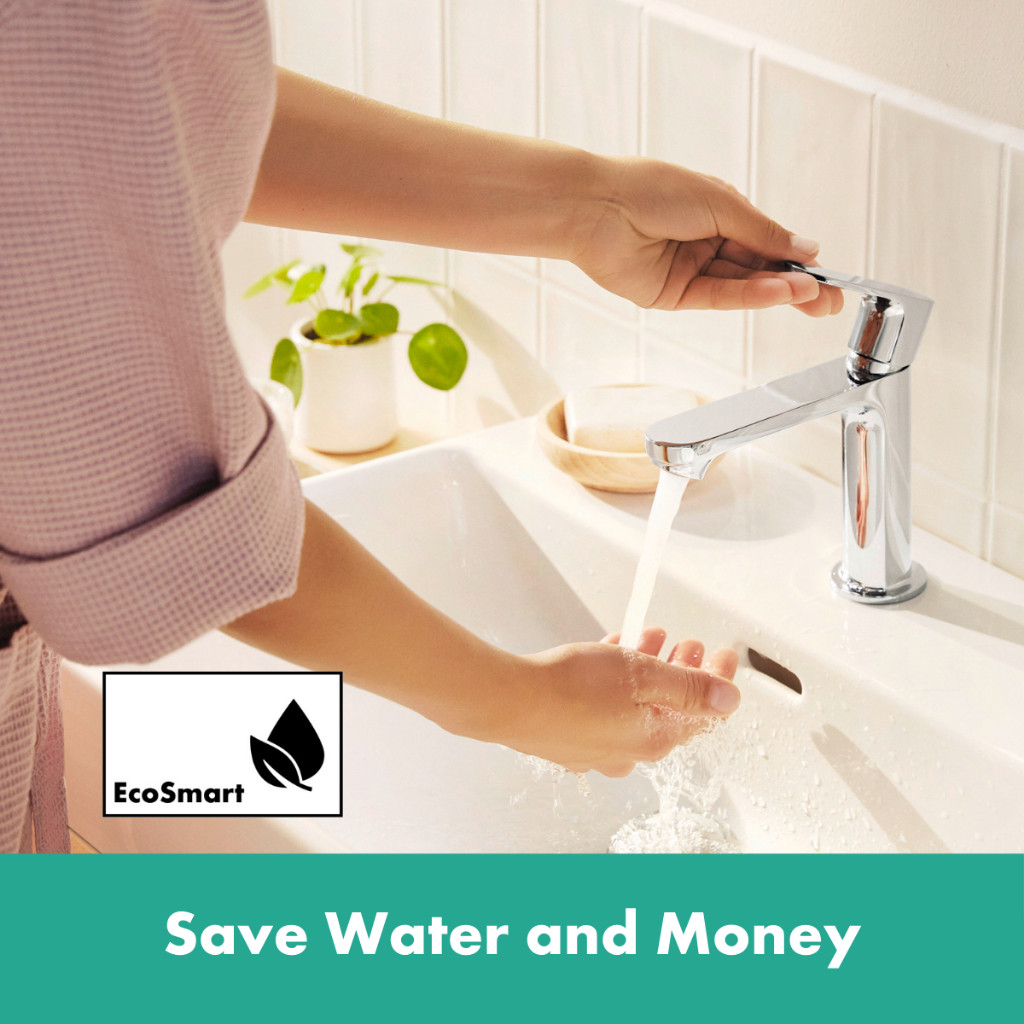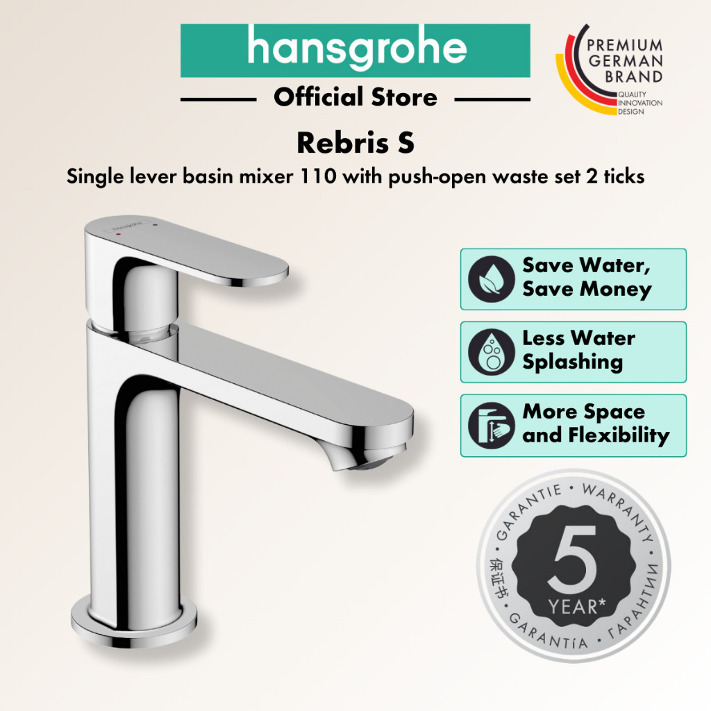hansgrohe basin mixer Rebris S - bathroom sink tap with spout height 110mm and push-open waste set, EcoSmart, 2 ticks