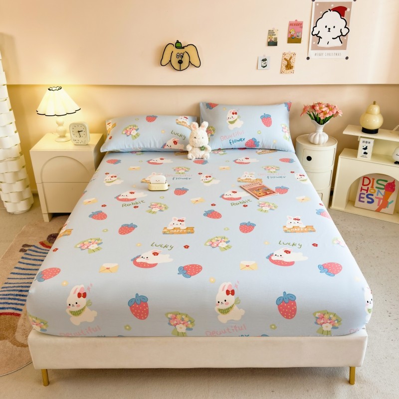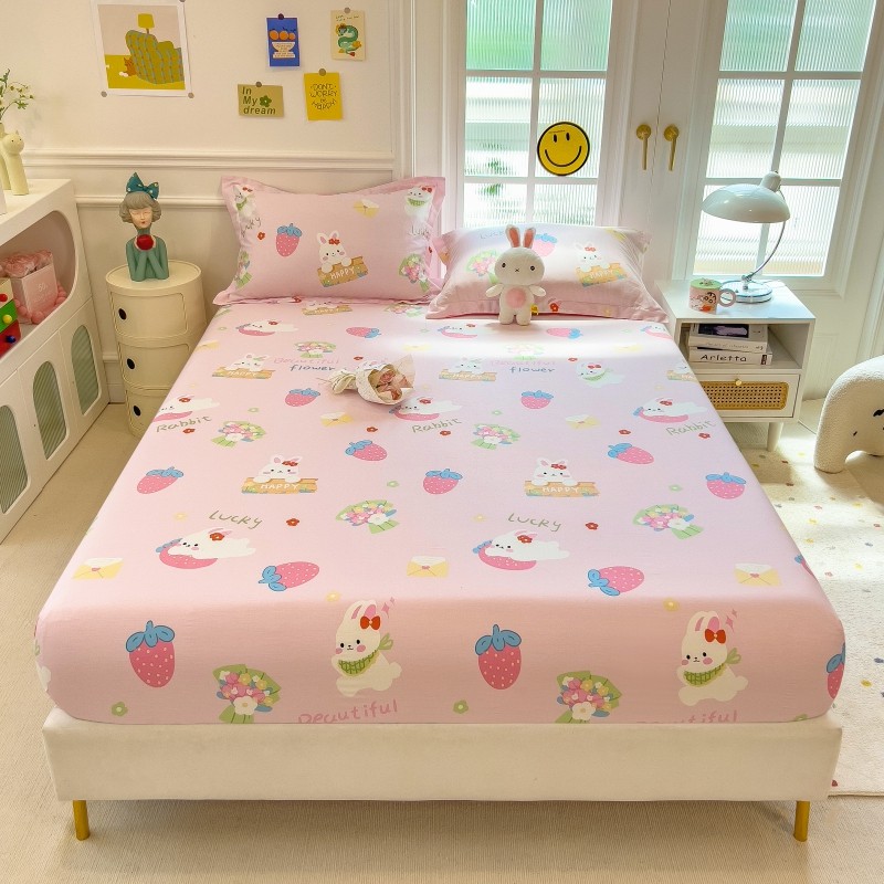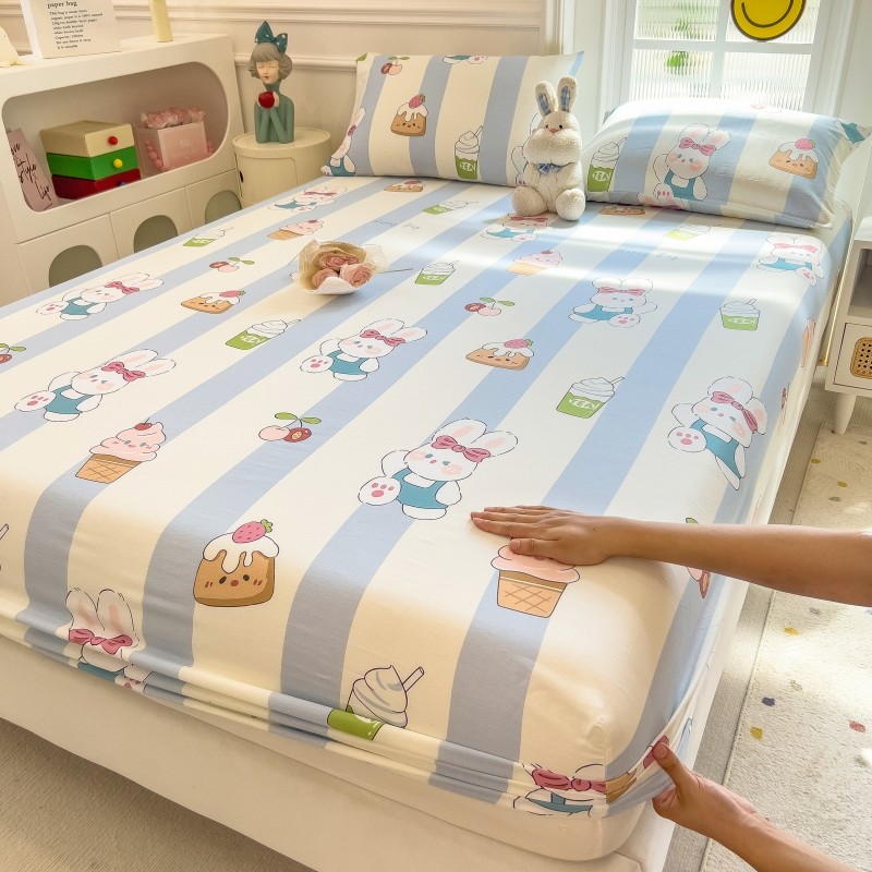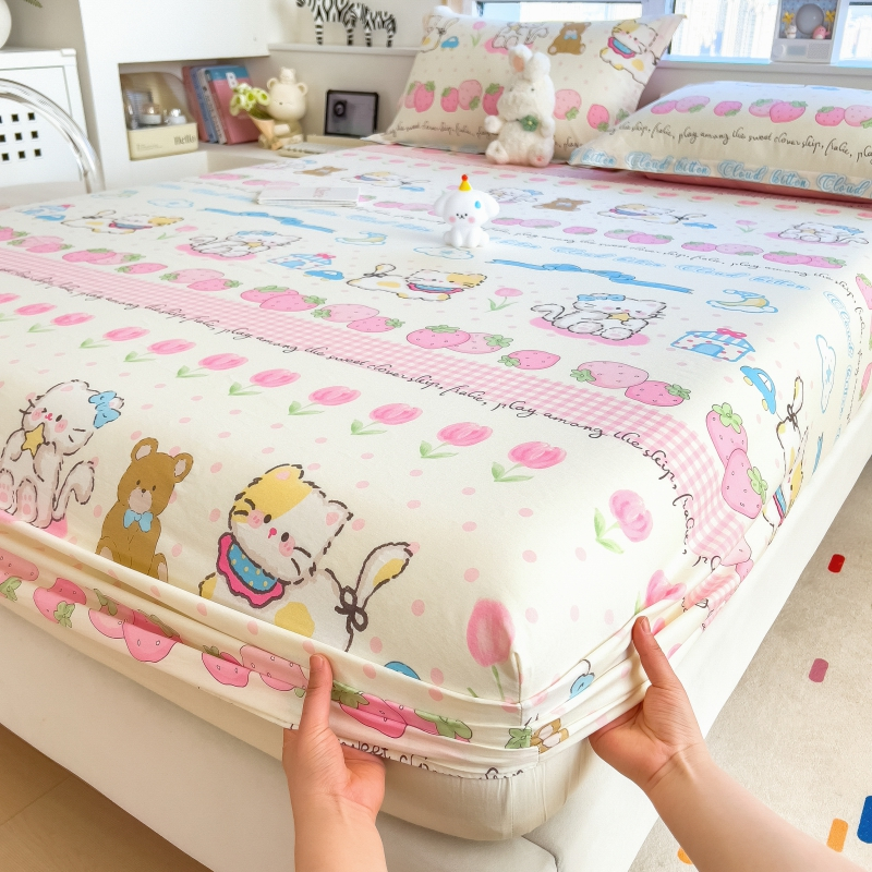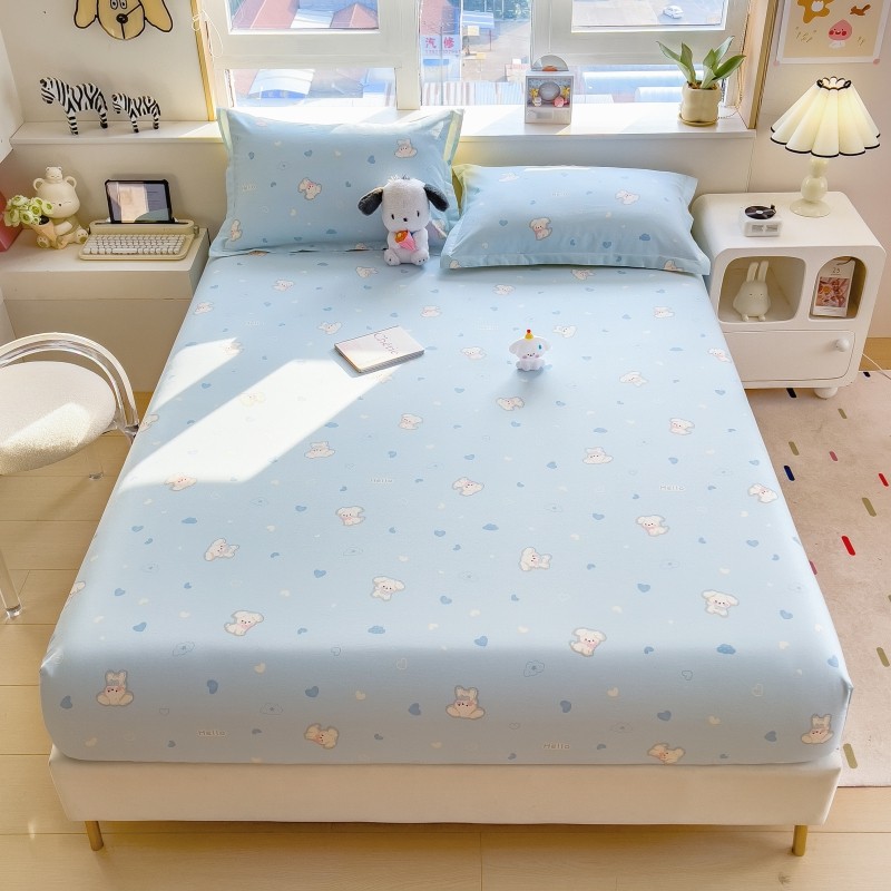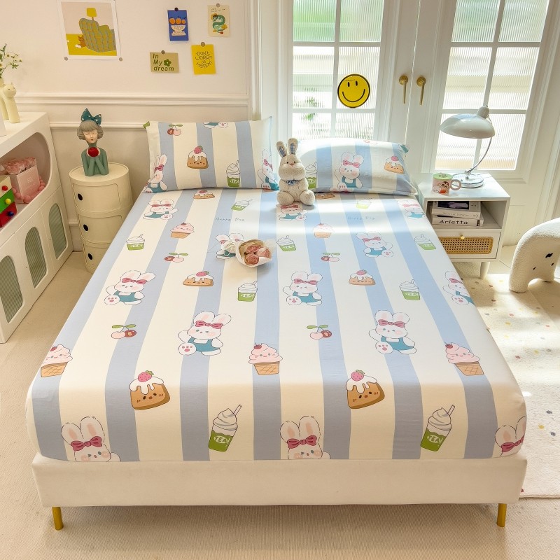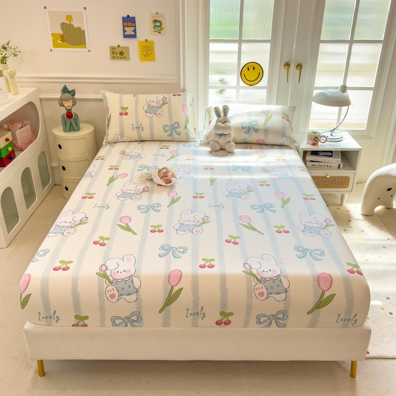 Happy bear rabbit Cute cartoon style 100% Cotton Fitted Sheet 800TC Skin-friendly Single /SuperSingle/ Queen / King Size pillowcase