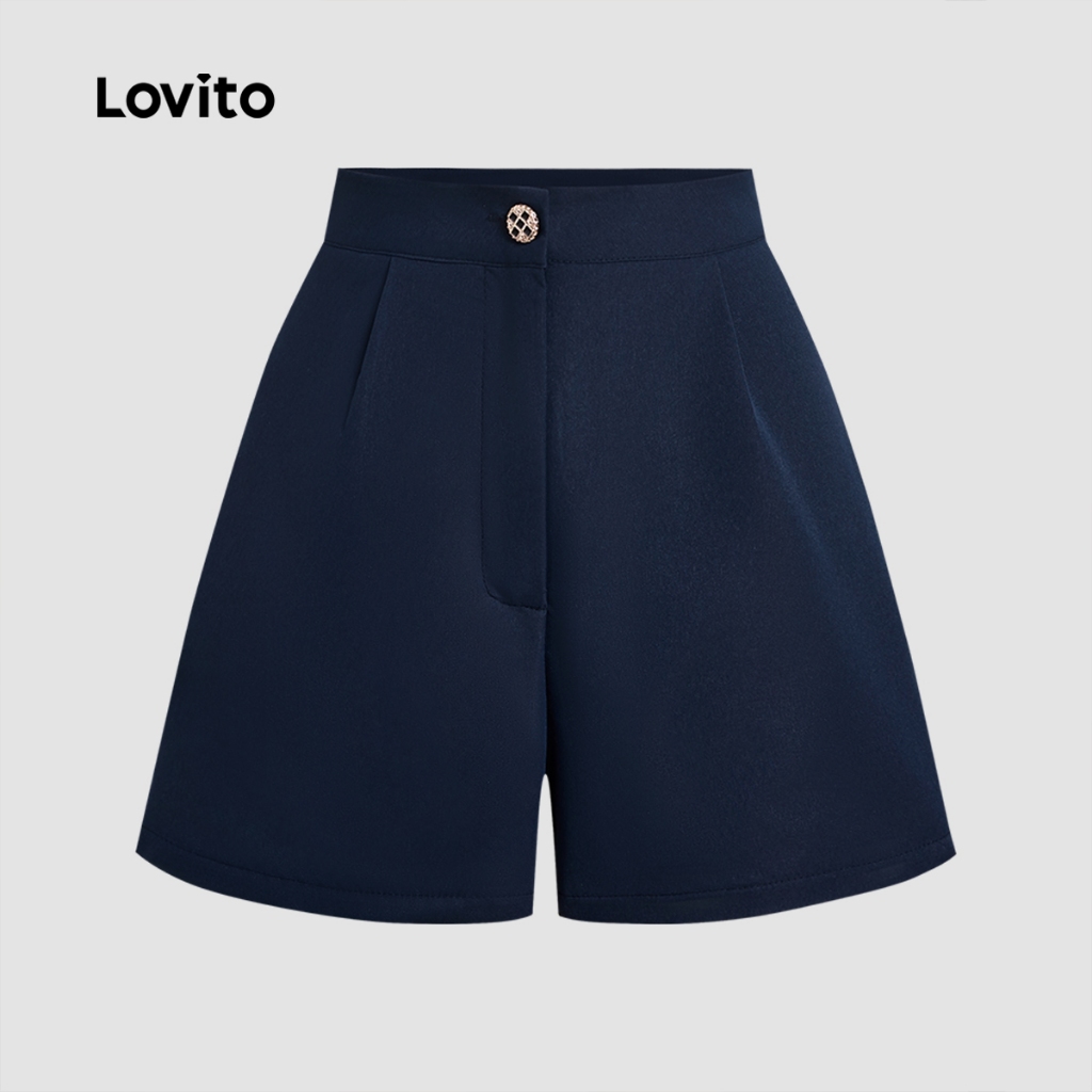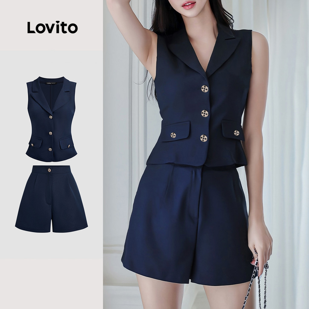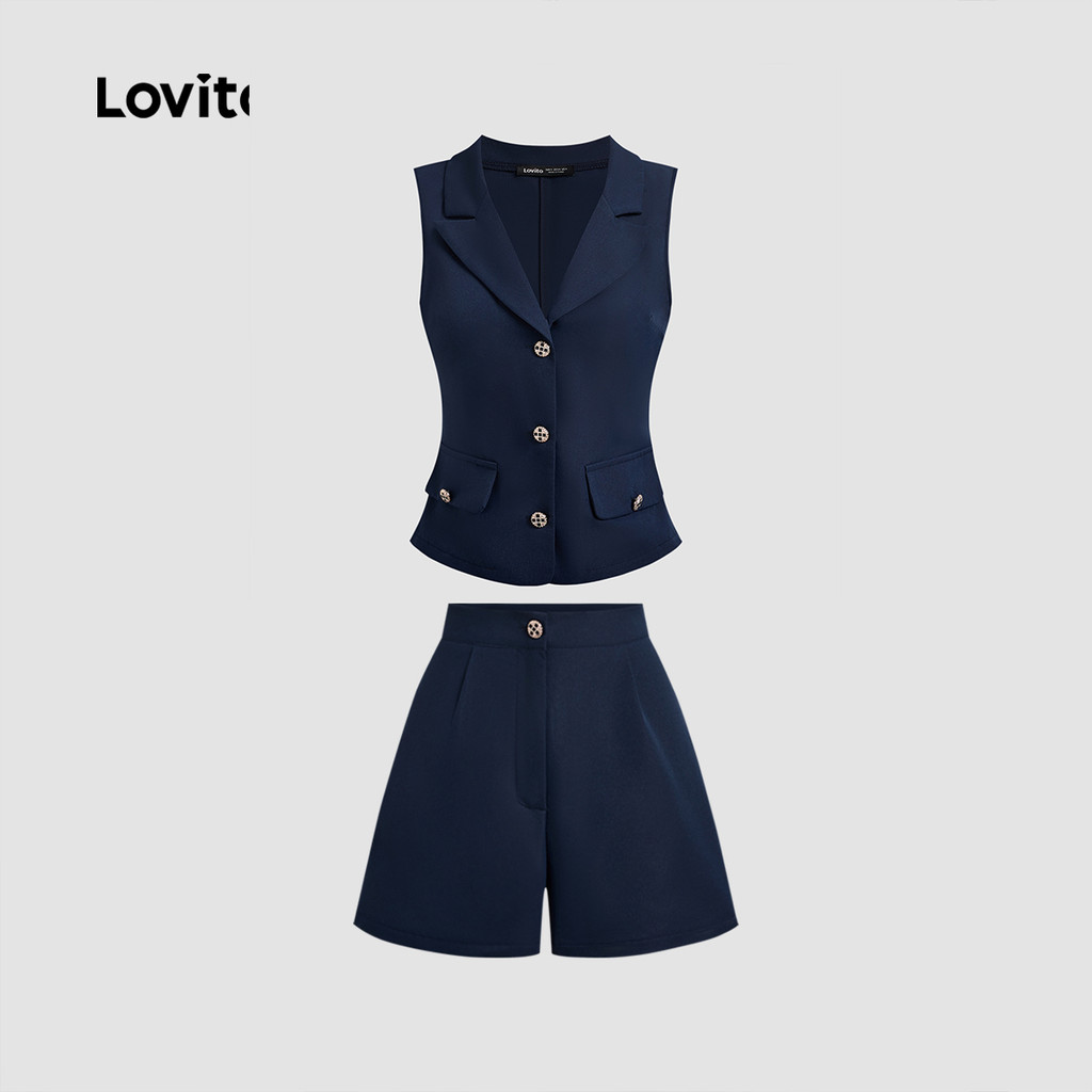 Elegant Shorts Sets Commute Button Spring/summer Navy Blue Top Shorts Sets for Women L138ED058