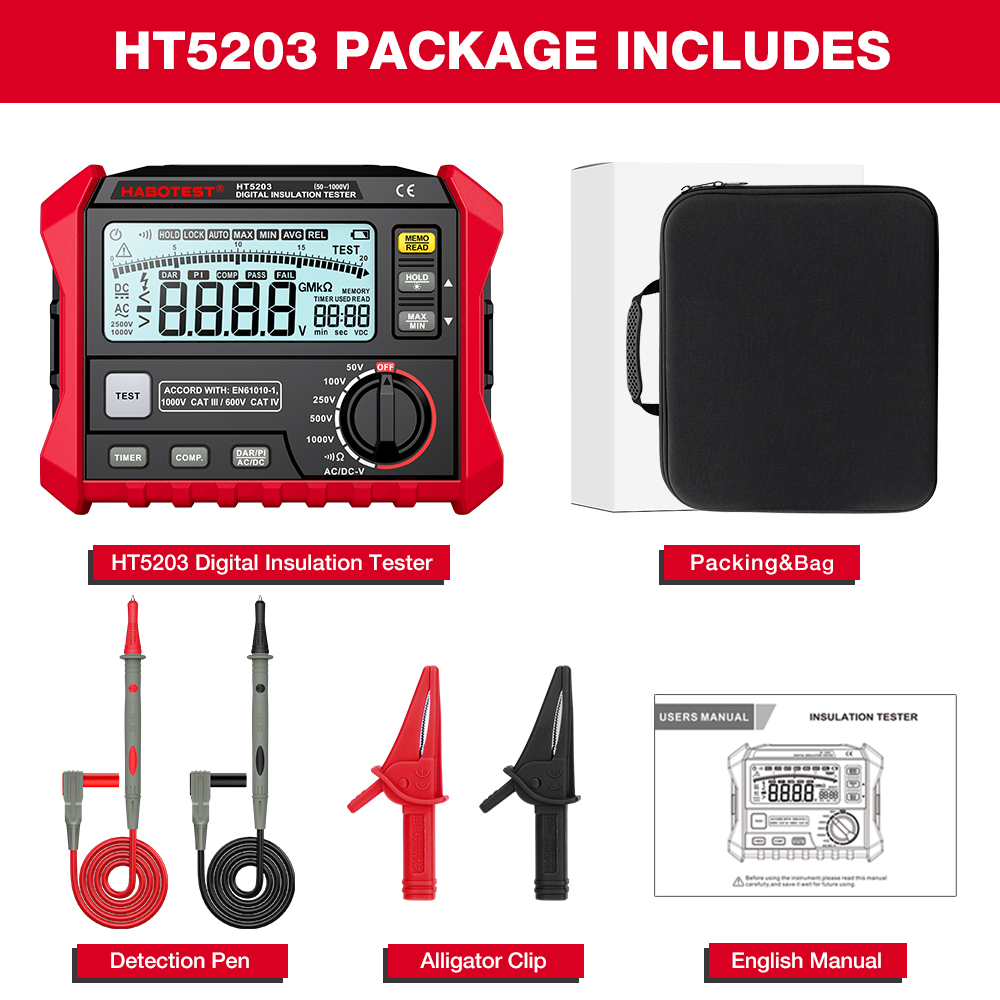 HABOTEST HT5203/HT5205 Digital Insulation Tester High Definition LCD Large Screen With Backlight Display AC/DC Voltage Measurement