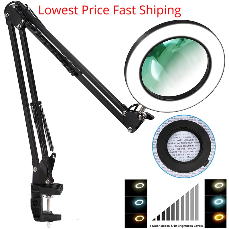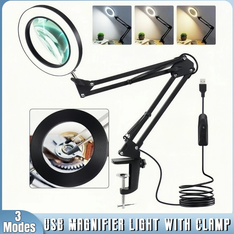 [SG Seller] Adjustable Magnifier Light LED Lamp 3 Color Modes USB Powered Magnifier Lamp with Metal Clamp