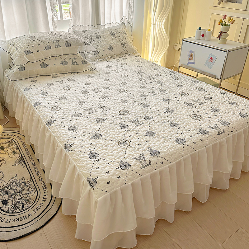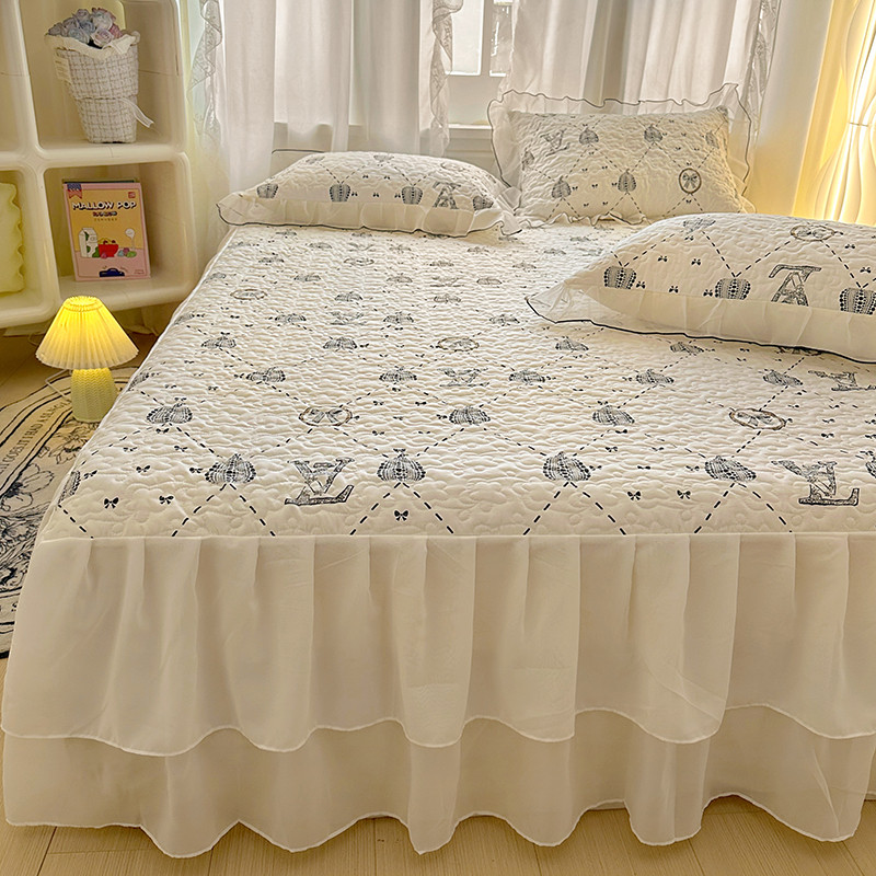 3 IN 1 Double Chiffon Lace Quilting Bed Skirt Pillowcase Princess Style Luxury Patter Print Bedsheet Queen King Size Cadar