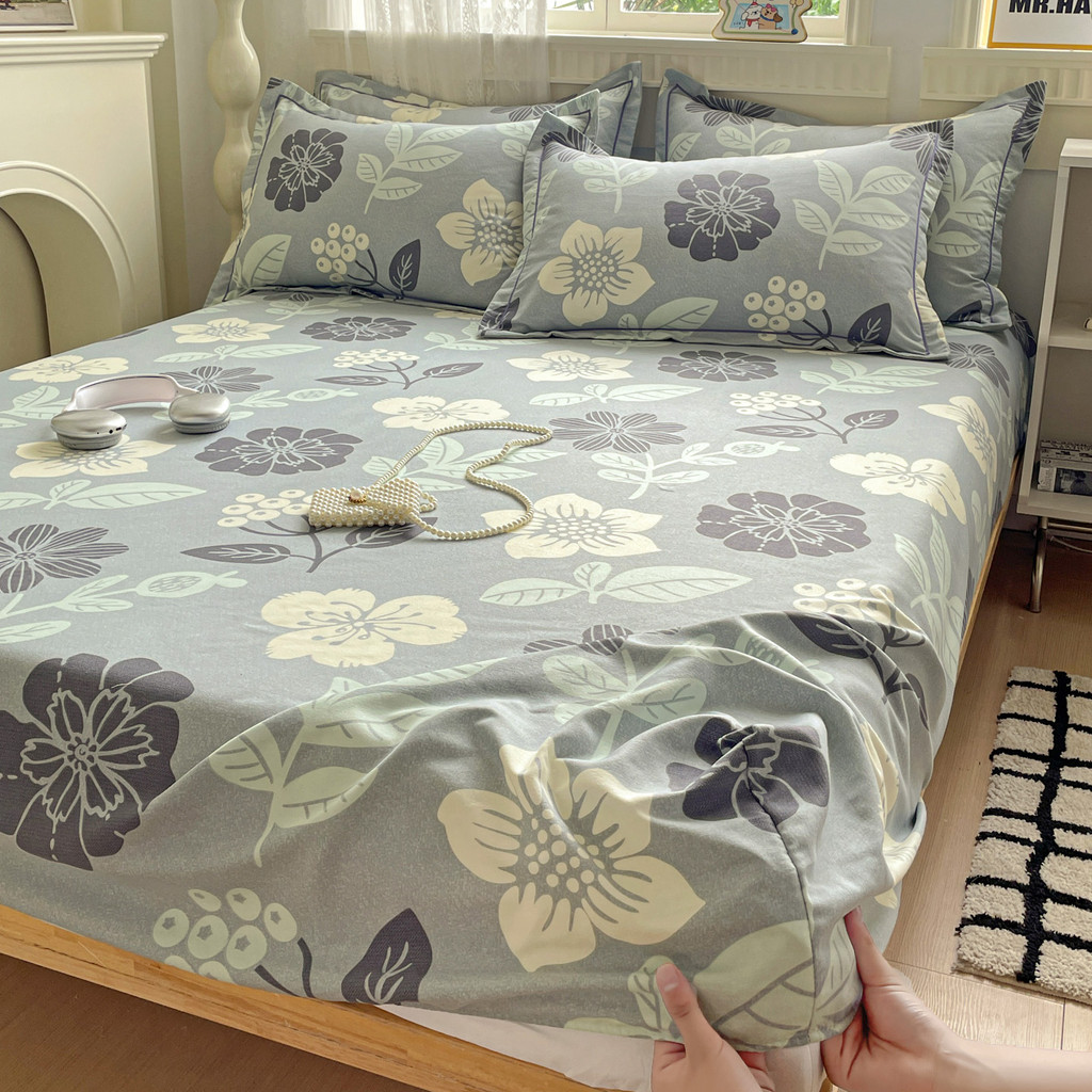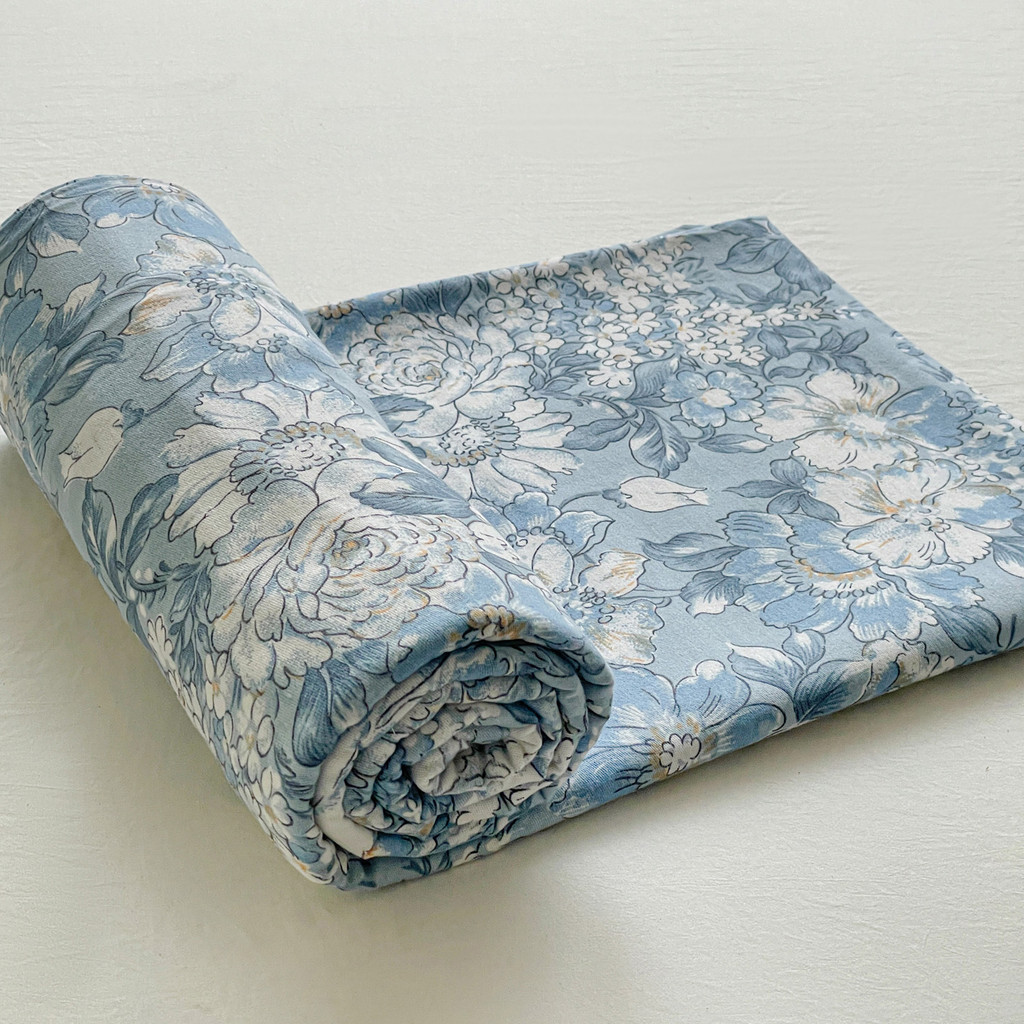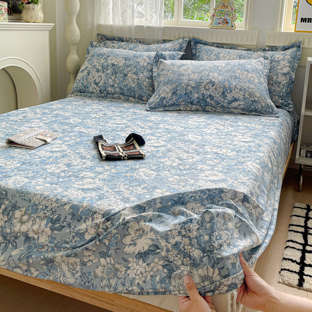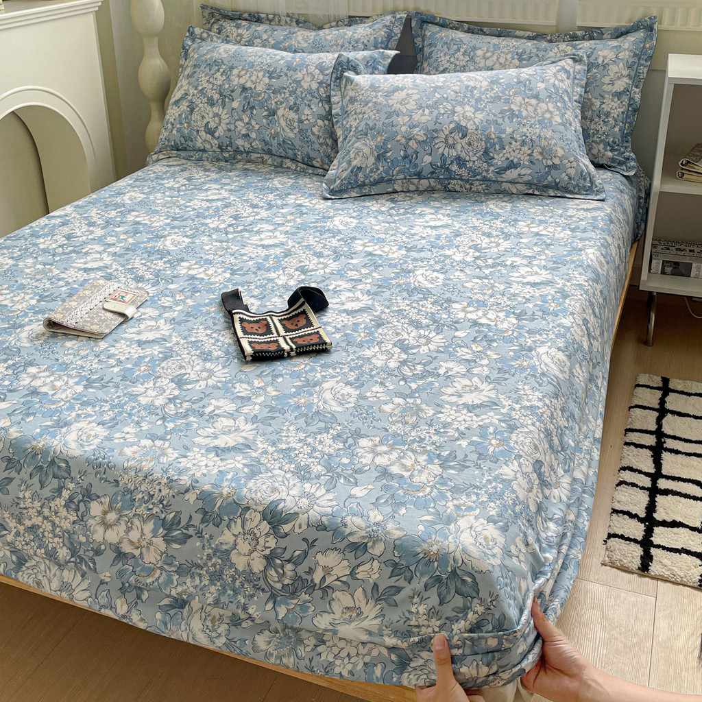 Cadar 1 PC 100% Cotton Blue Flowers Print Brushed Fitted Sheet Fashion INS Style Bed Mattress Cover Single/Super Single Queen King/Super King Size Bedsheet