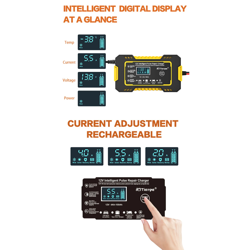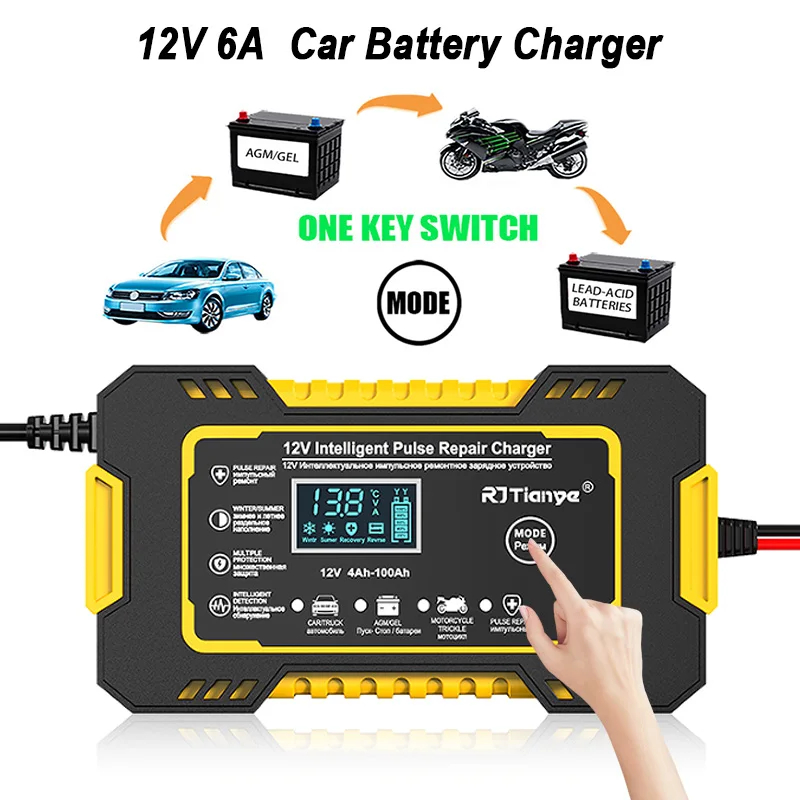 Car Battery Charger 12V 6A Smart Fully Automatic Battery Charger LCD Screen Car Truck Motorcycle Lead Acid Batteries