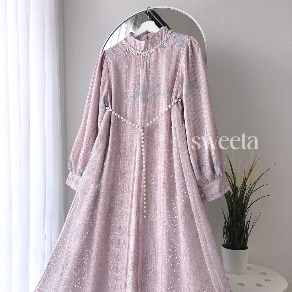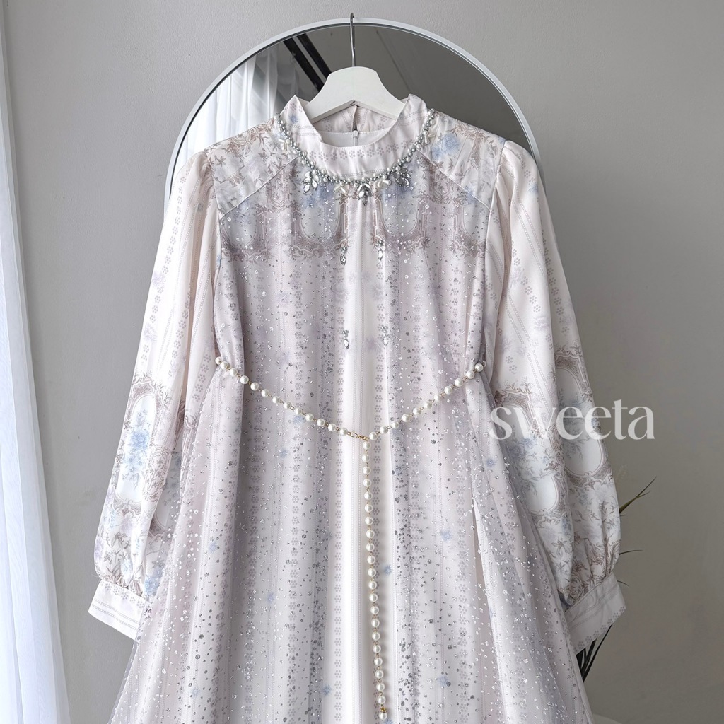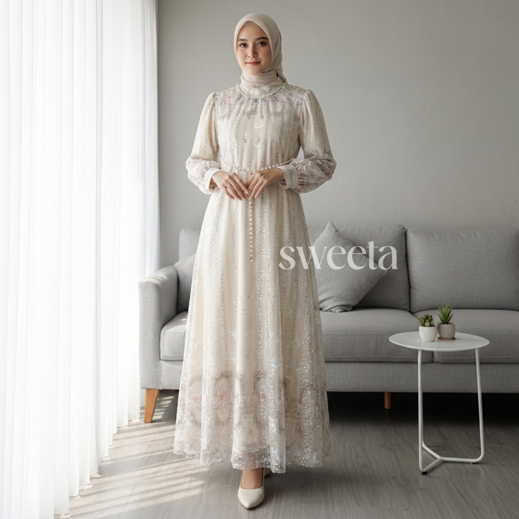 SWEETA | Gamis Ceruty Payet Mix Tille Glitter | Pearl Belt | LD 110 cm | Muslim Women's Clothing