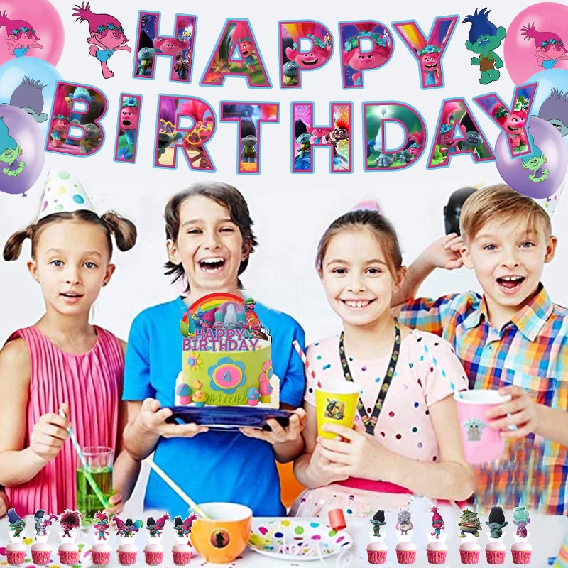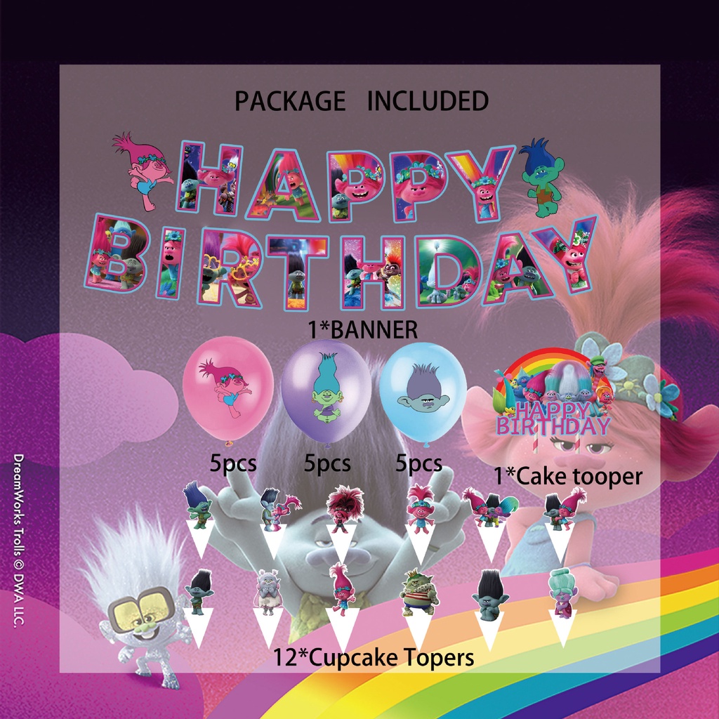 trolls Theme kids birthday party decorations banner cake topper balloon set supplies